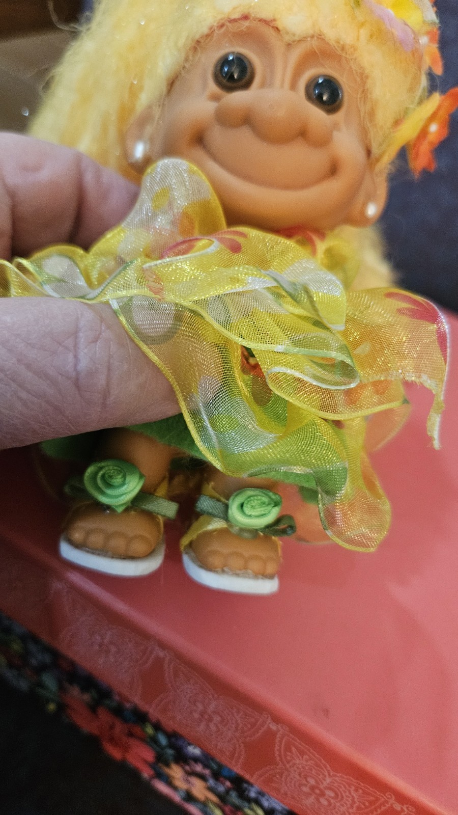 как выглядит OOAK Troll Doll SUNNY, Yellow Sparkle Yarn Hair, Beautiful Dress, Sandals, Purse фото