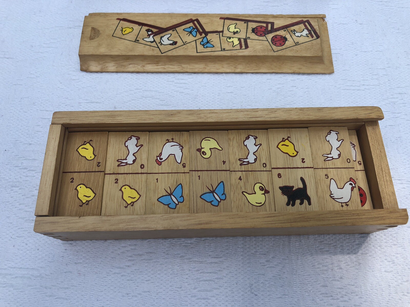 как выглядит Vtg 1986 Wooden Animal Dominoes Set Wood Box Slide Lid and original box фото