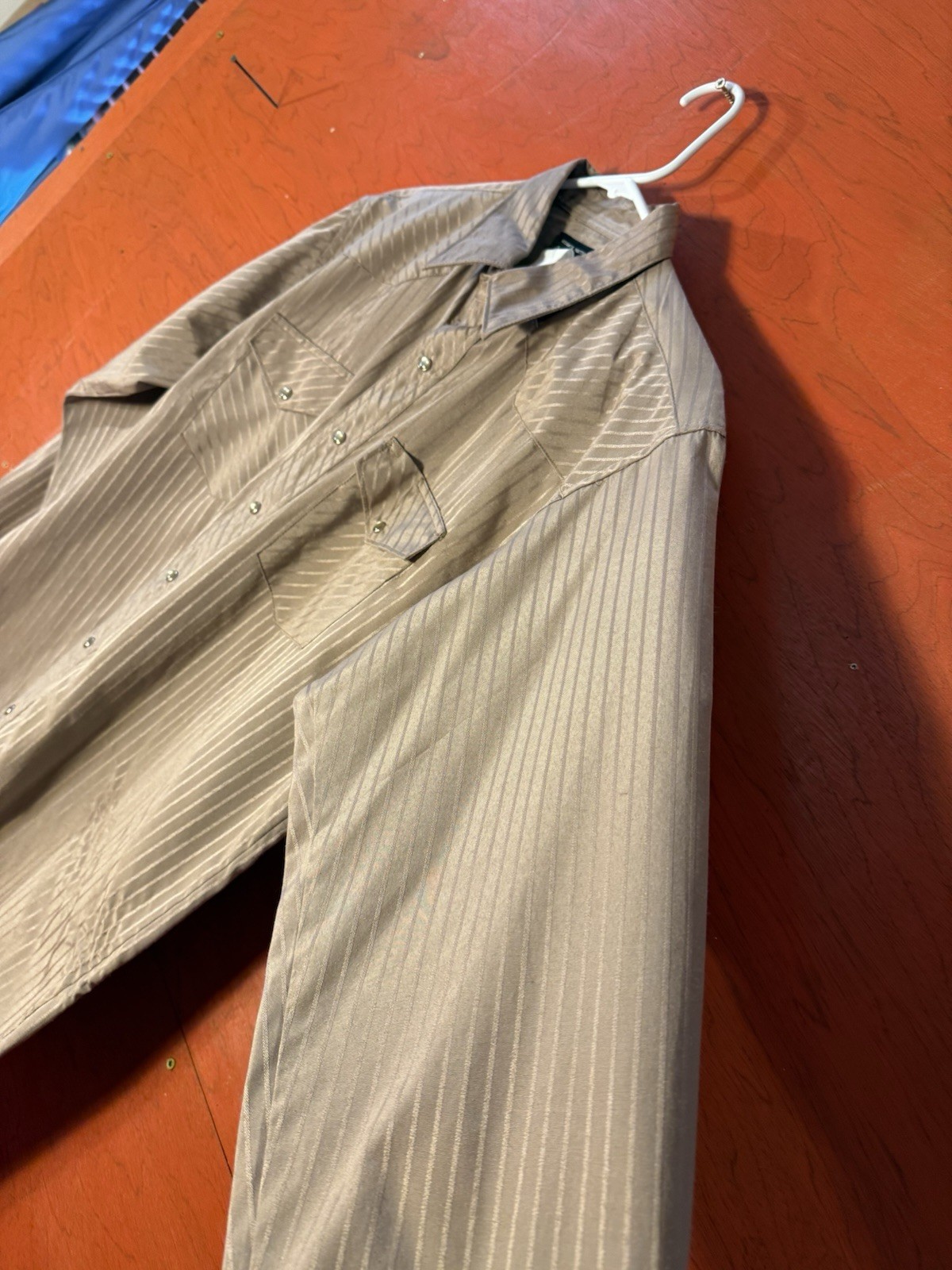 Wrangler cowboy dress shirt Beige LrgTall Western Snap, Shiny Gold Pin Stripes.