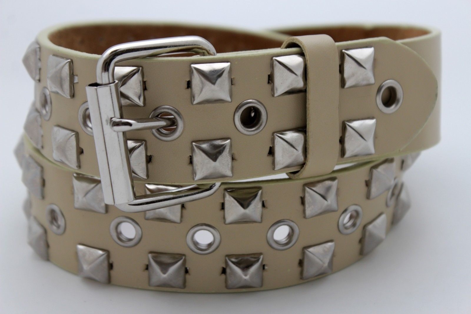 New Punk Rock Beige Color Faux Leather Silver Pyramid Studded Belt Size S M L XL