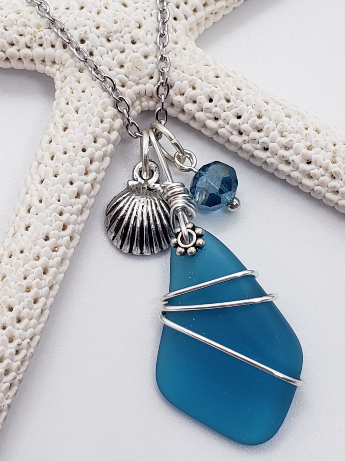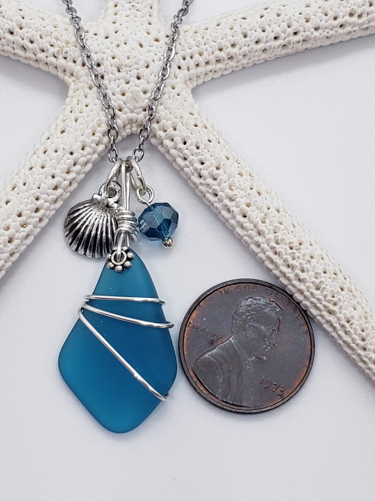 как выглядит Sea Glass Necklace w/ Cultured Petite Teal Blue Pendant Silver Wire Wrapped фото