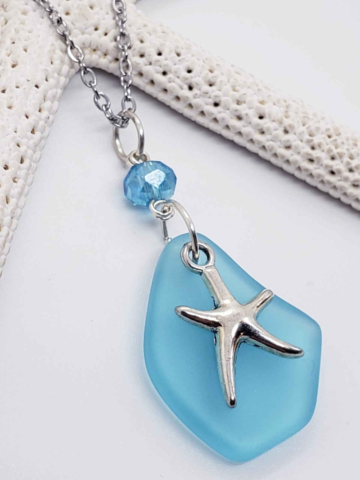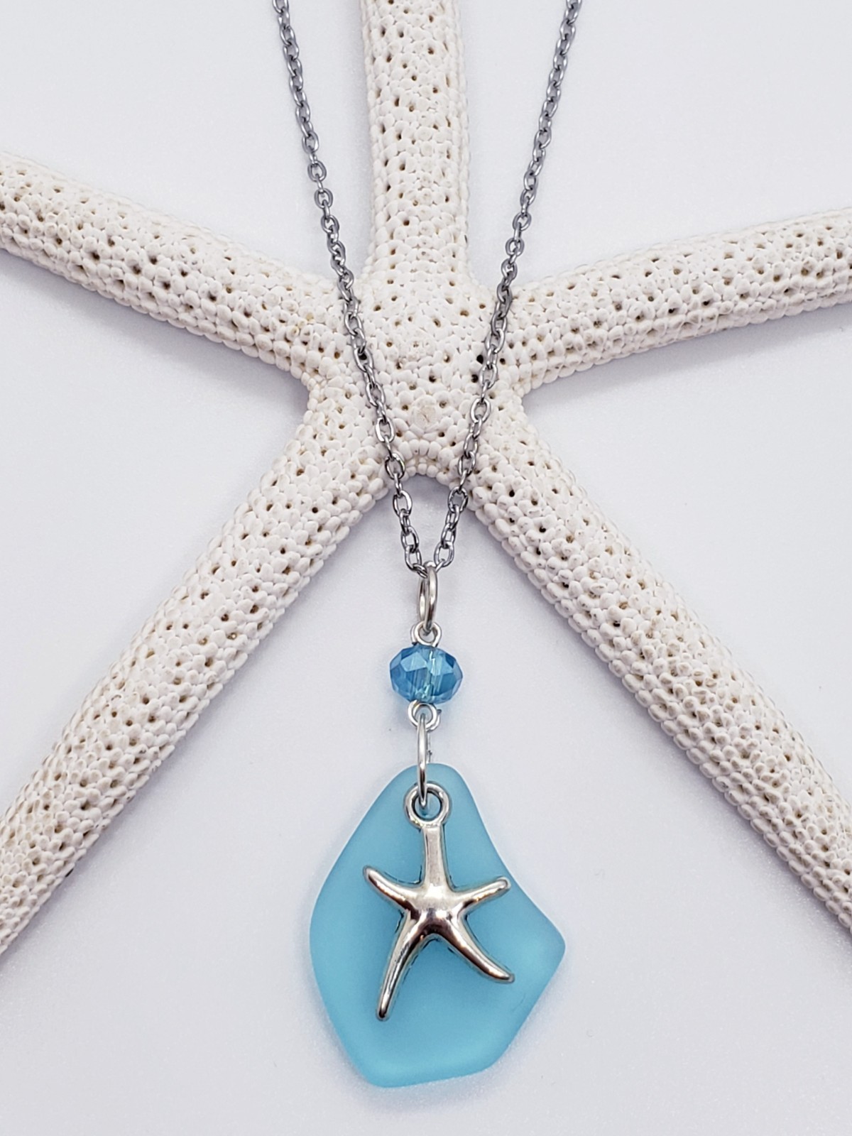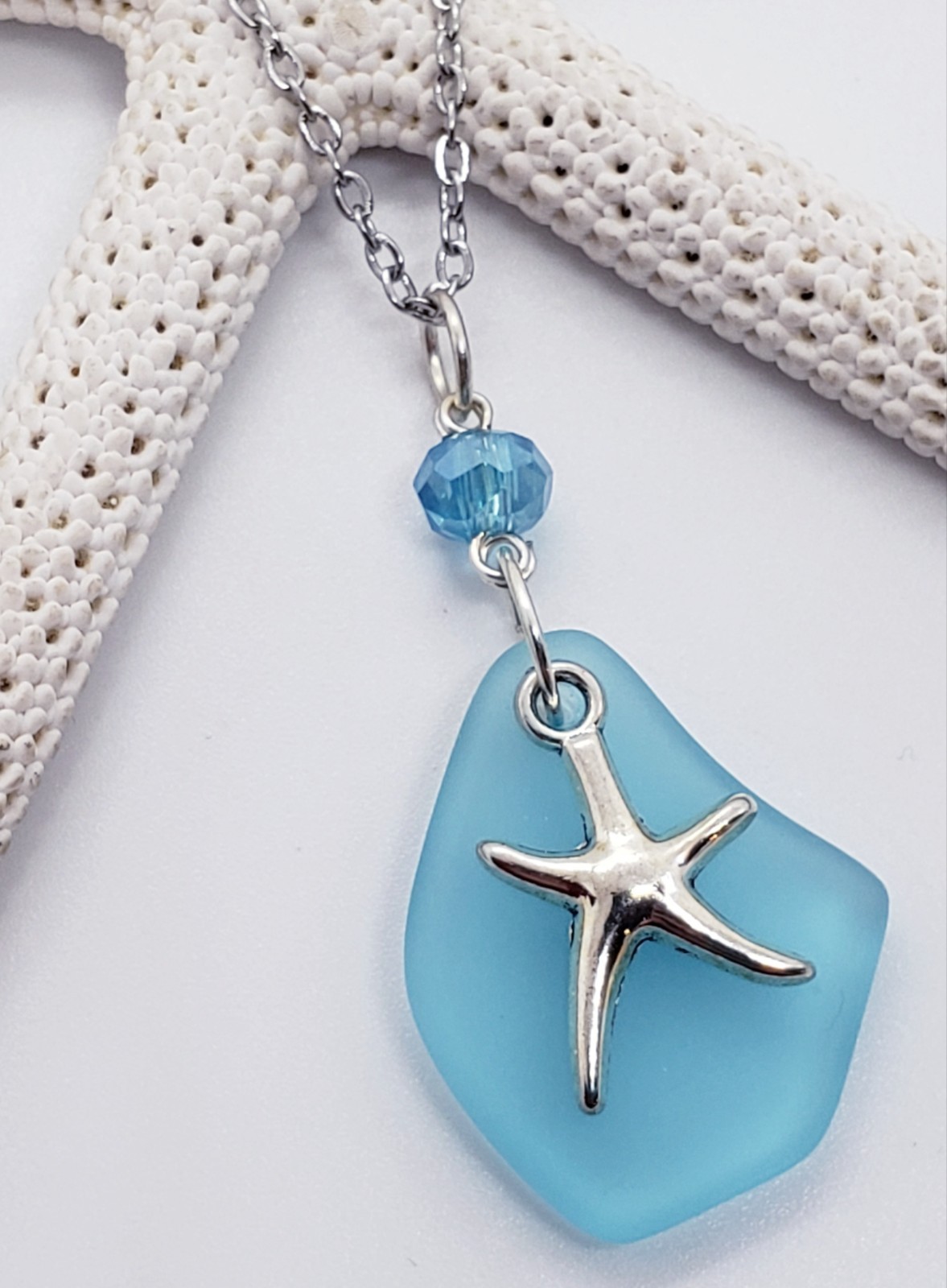Sea Glass Necklace Jewelry w/ Cultured Aqua Blue Pendant Starfish Charm