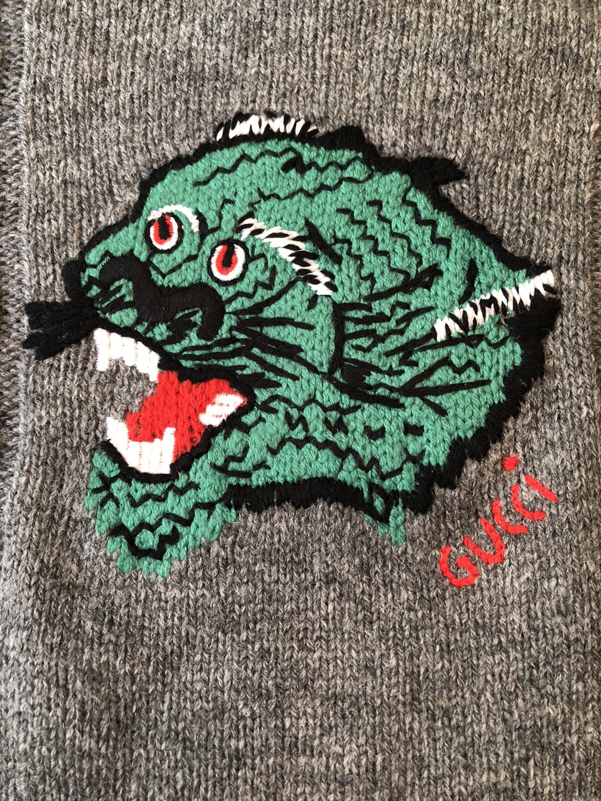 100 Authentic GUCCI Gray Green Panther Face Jacquard Wool Sweater Size: M
