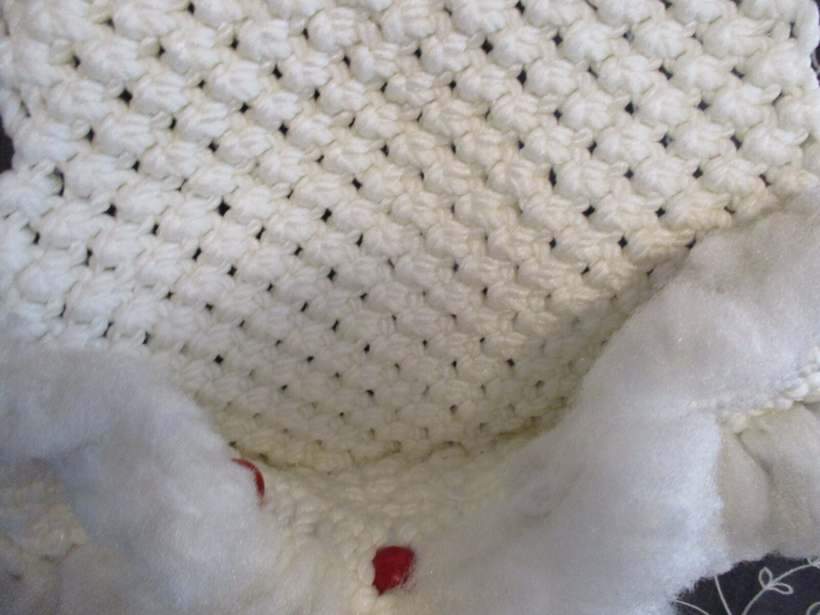 • Vtg Macrame Christmas Tree Wall Hanging three pockets white red beads 3 ft MCM