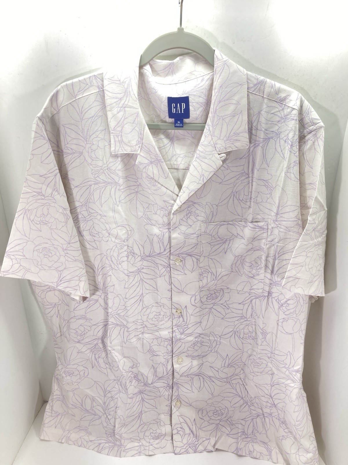 Gap Linen Camp Shirt Men XL White Purple Floral Button Short Sleeve Casual NWT