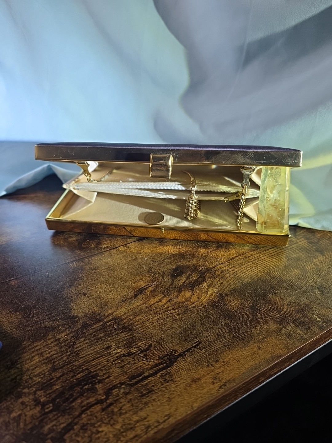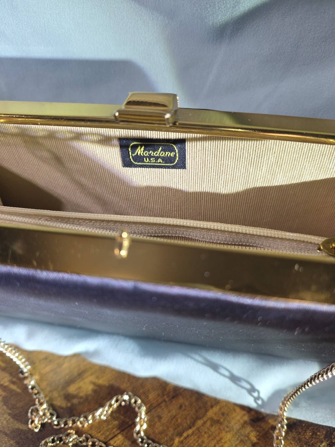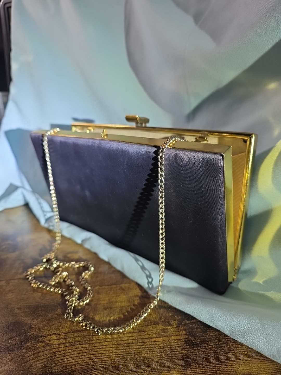 как выглядит 1950s Vintage Made In USA Mardane BLACK satin Clutch W/Gold Tone Hardware. фото