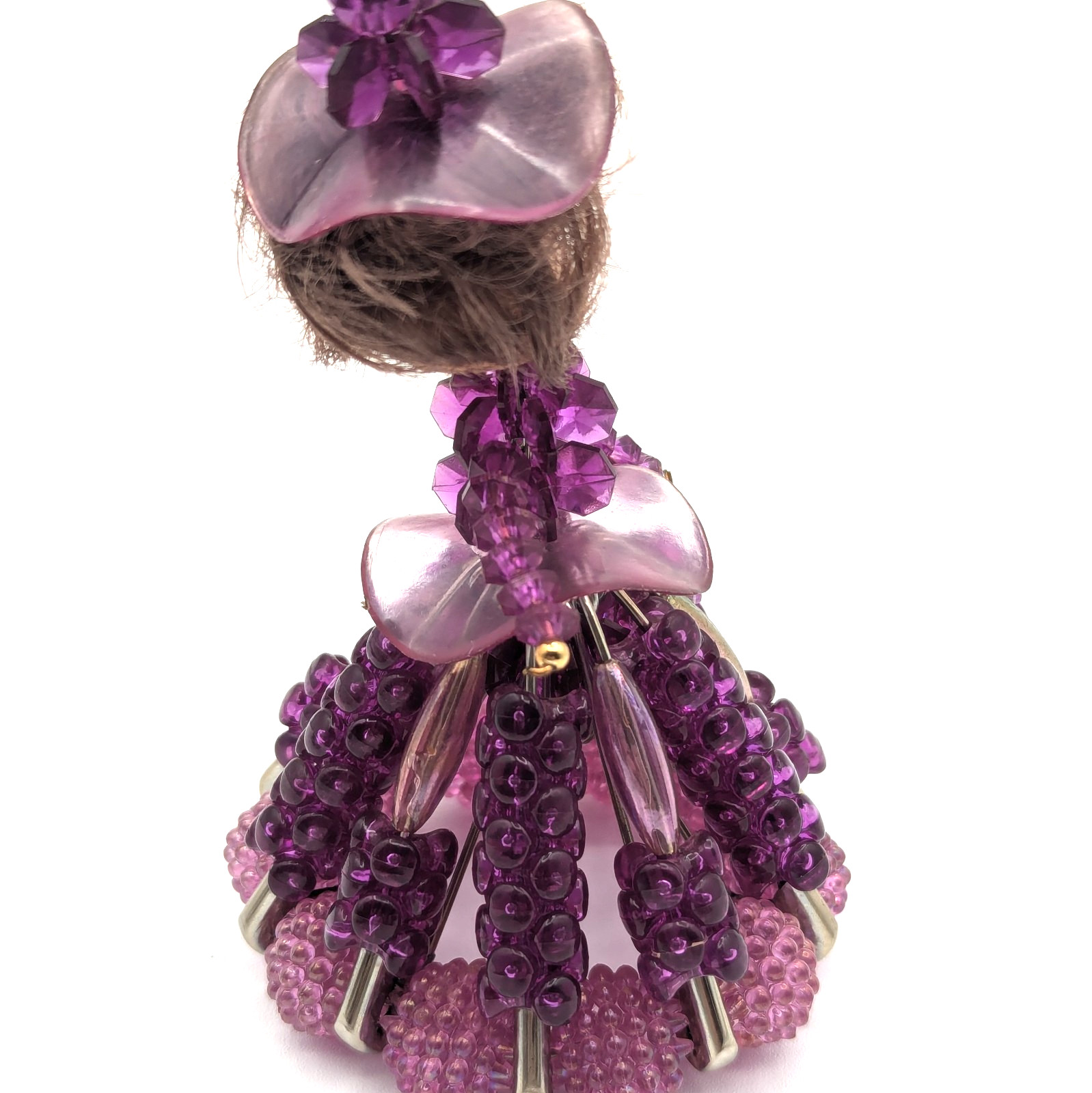 Vintage Kitschy Doll Safety Pin Beaded Purple Dress Hat Girl Brunette 4.5