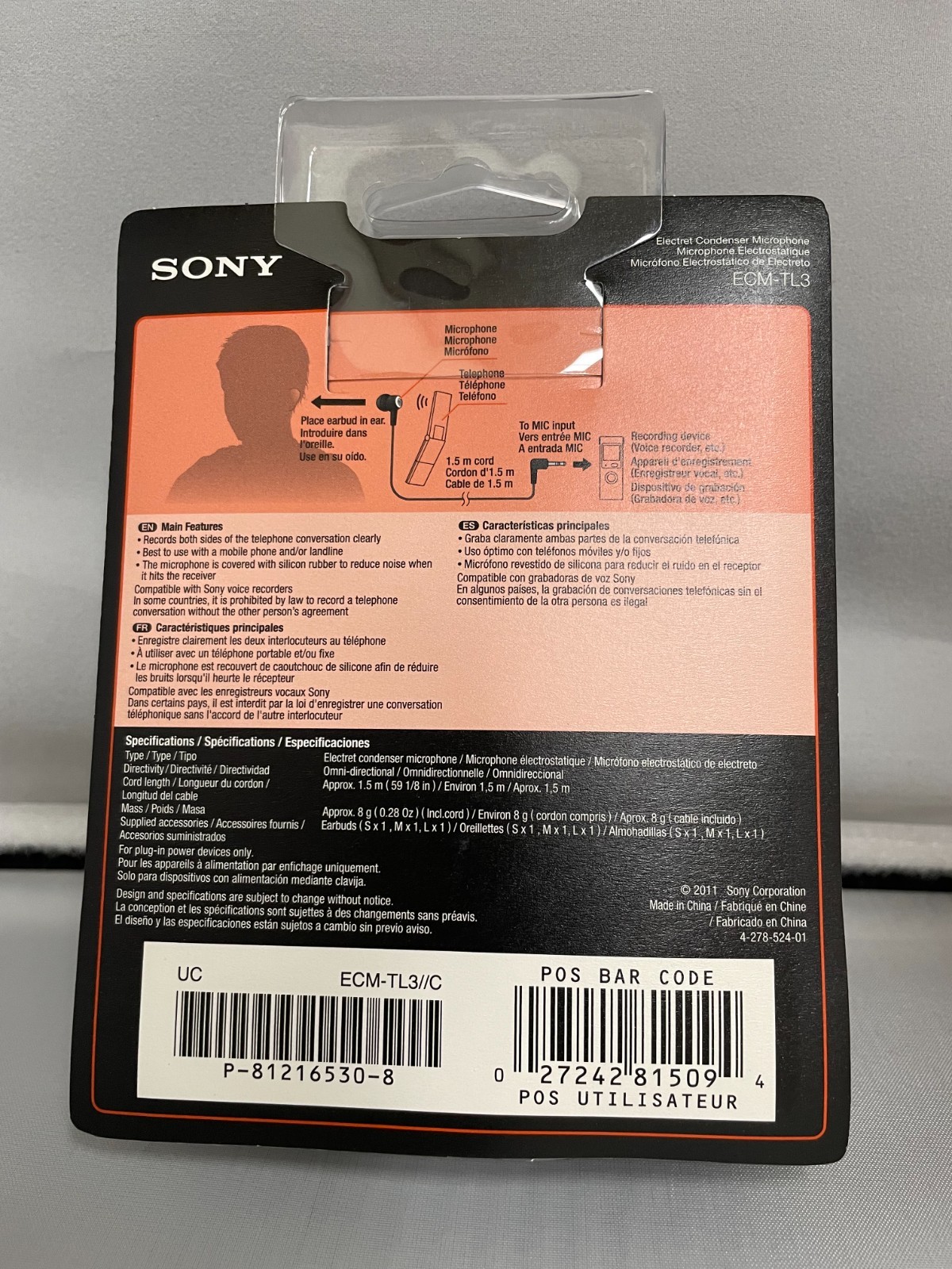 SONY ECM-TL3 Earphone-style electret condenser microphone for Digital Imaging