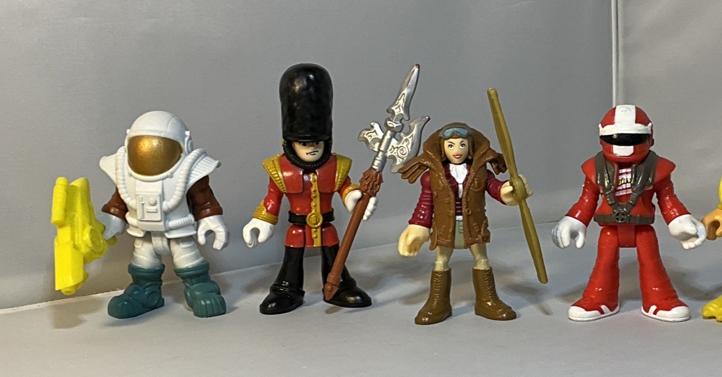 как выглядит 7 Imaginext Blind Bag Figures W/ Accs-Space Ape, Beefeater, Soccer, Chicken Man фото
