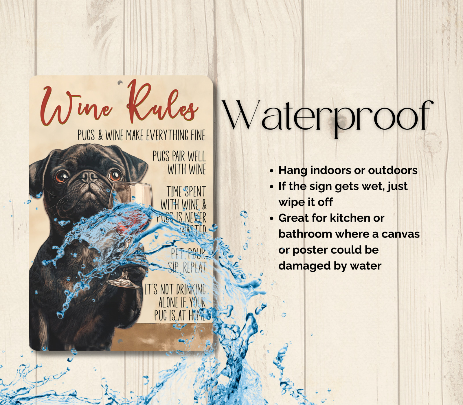 • Pug Wine Rules Sign bar black dog metal tin funny decor rustic wall art handmade