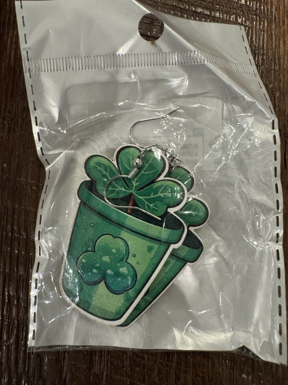 St Patrick's Day Earrings Green Leaves lrish Shamrock Clover Wooden Dangle
