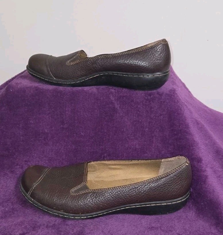 как выглядит Womens Clarks Size 8 Leather Brown Slip on Loafer Shoes фото