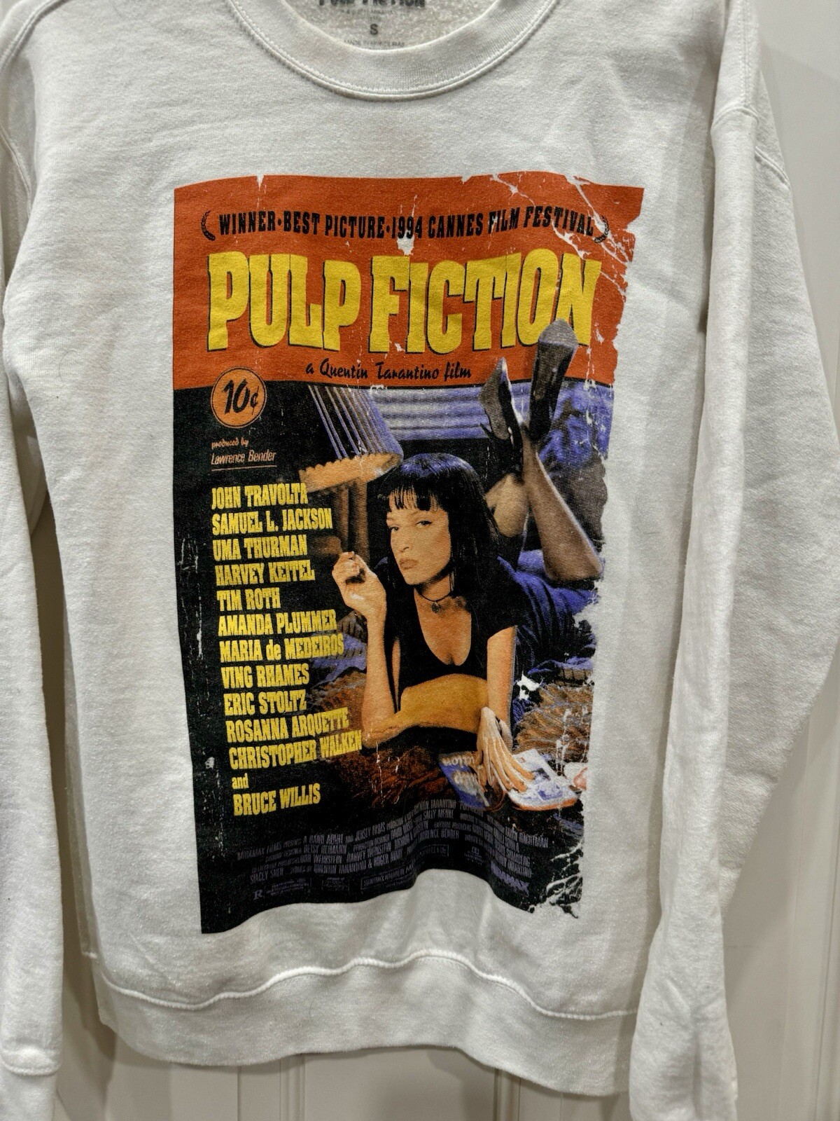 как выглядит Vtg Pulp Fiction White Sweatshirt Sz S Quentin Tarantino Film Movie Y2K Fiction фото
