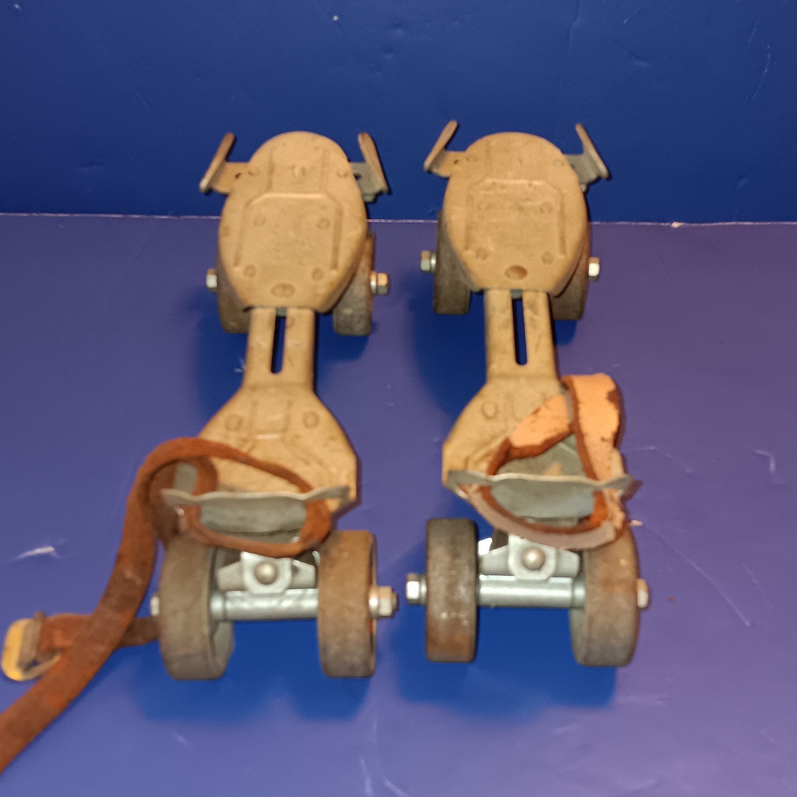 как выглядит HUSTLER VINTAGE 1930S ALL METAL ROLLER SKATES PAIR - LEATHER STRAPS ROUGH SHAPE фото