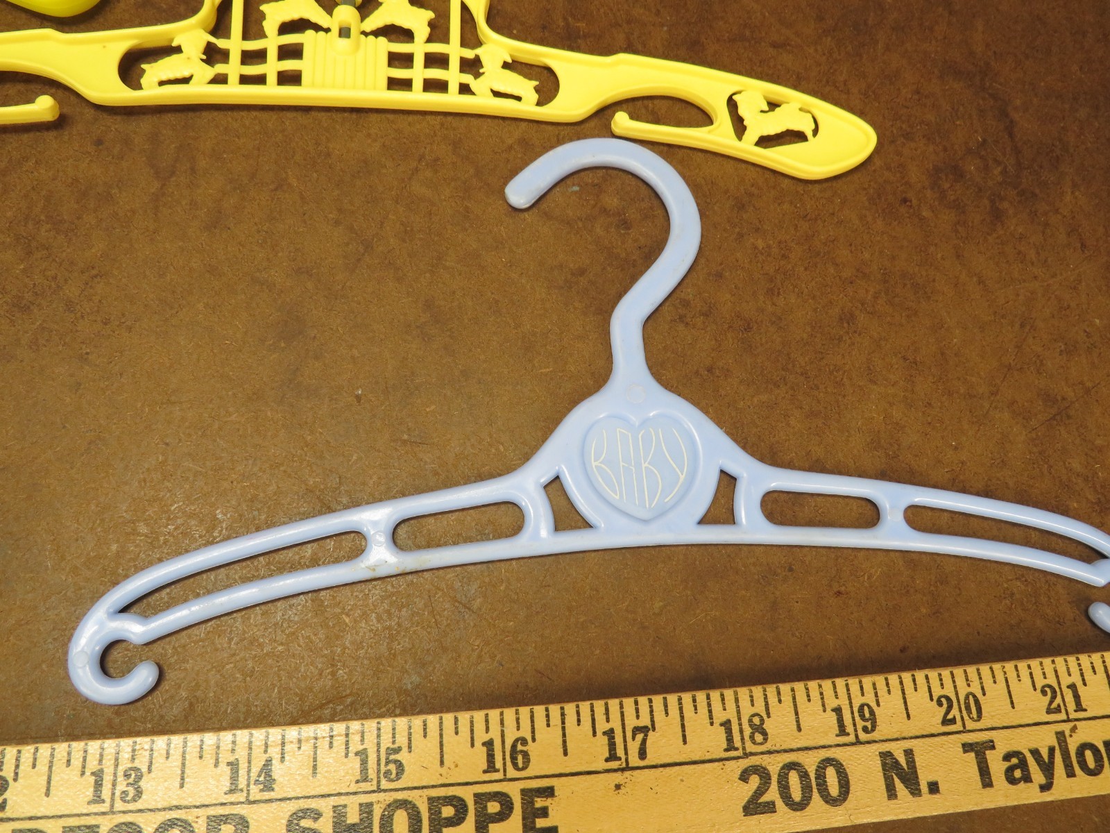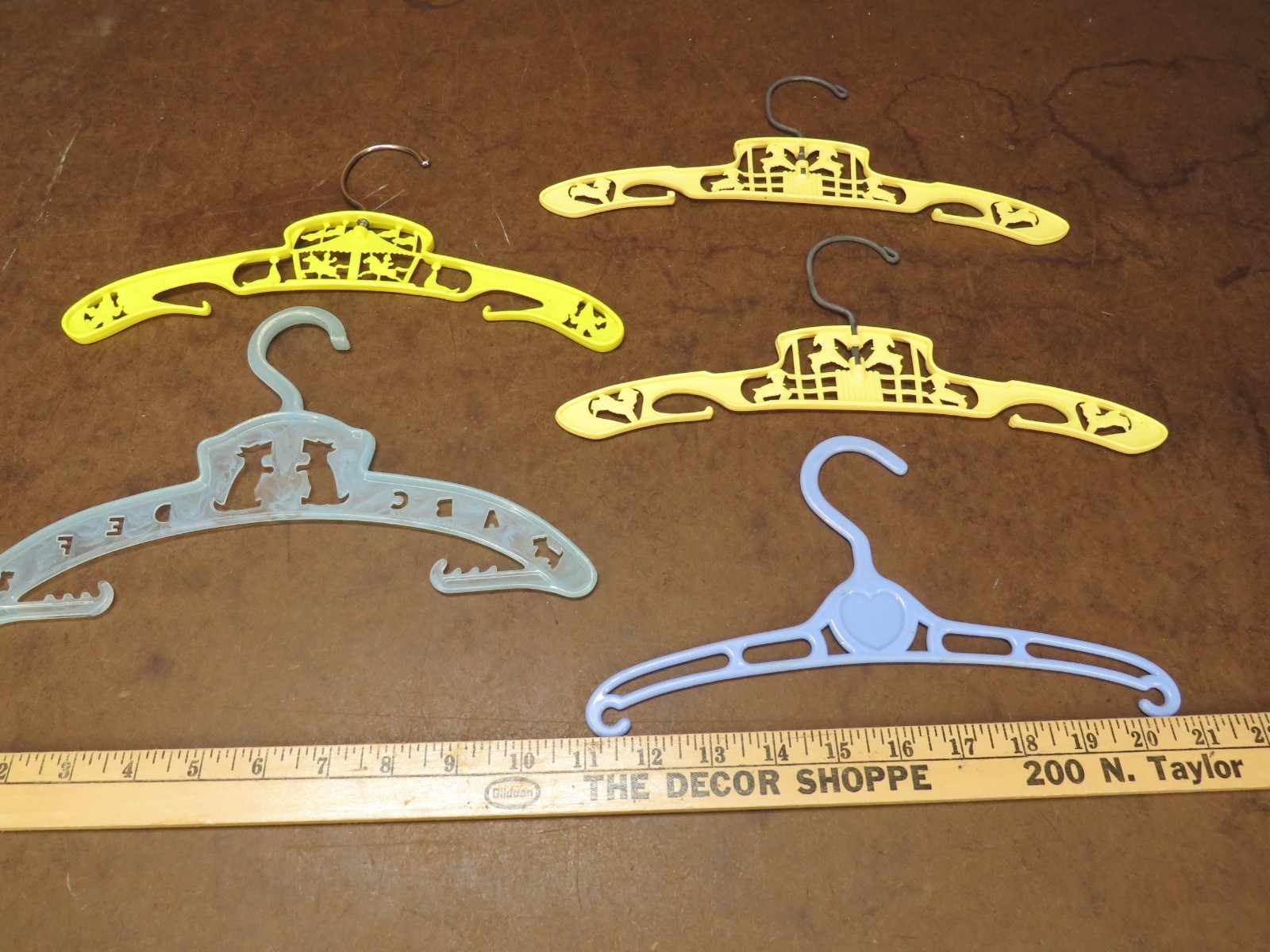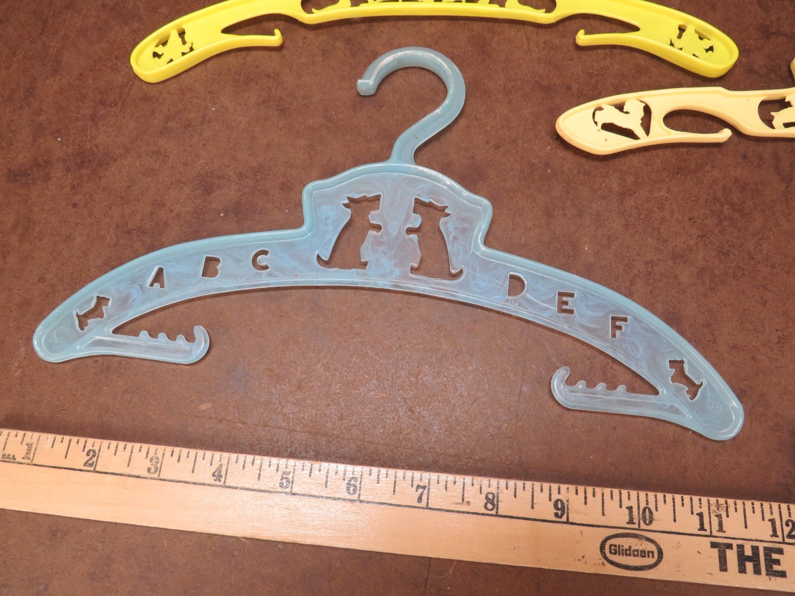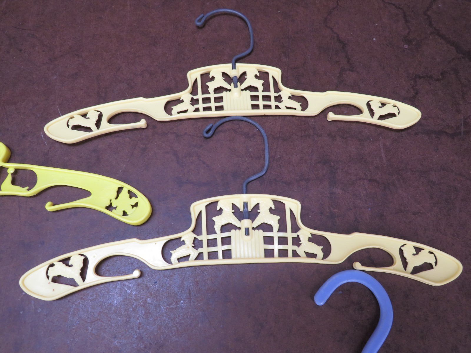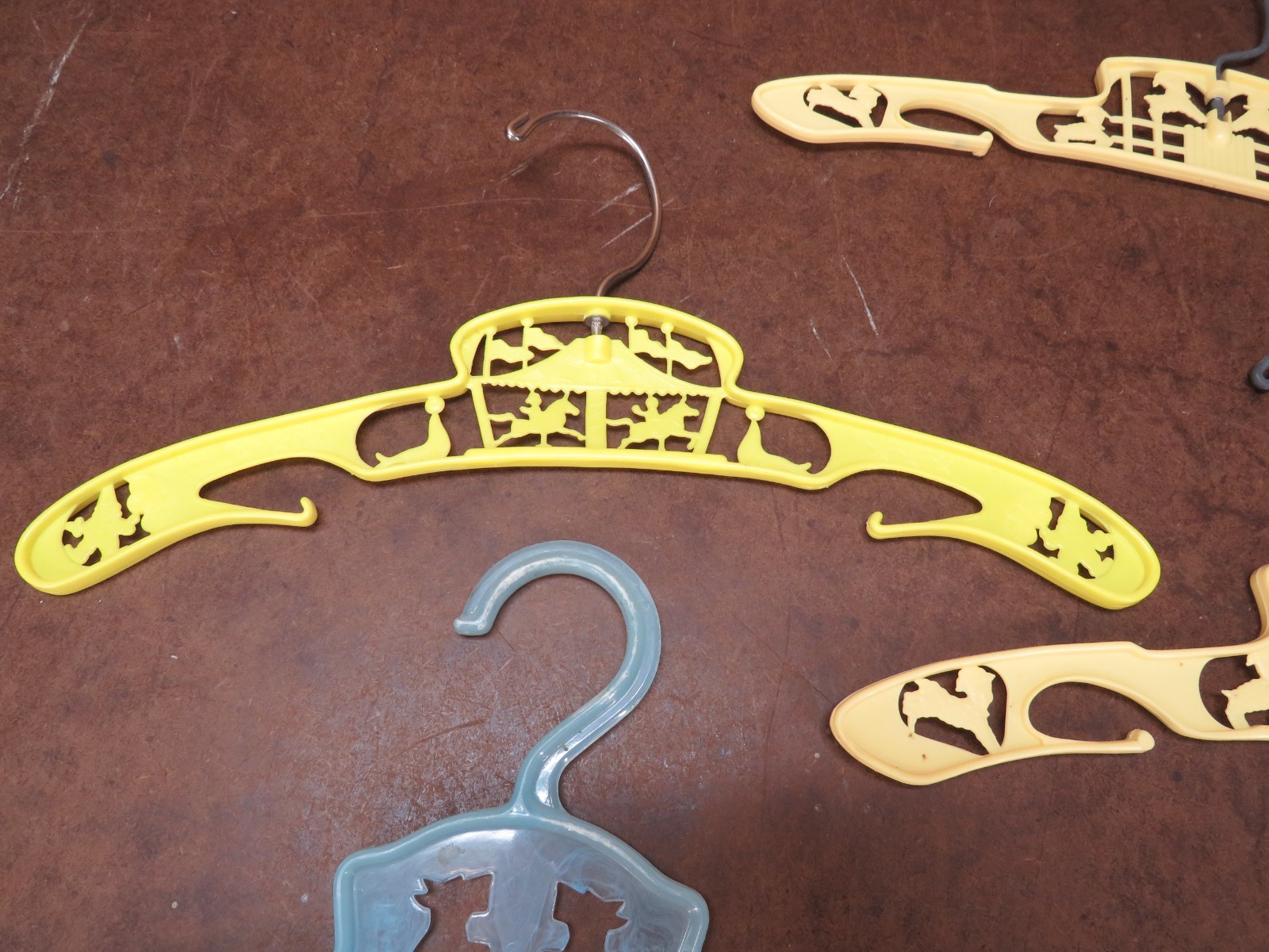 5 VTG CHILD'S PLASTIC SWIVEL HANGERS-BLUE PINK DIE-CUT CIRCUS TRAINS NY USA EVC