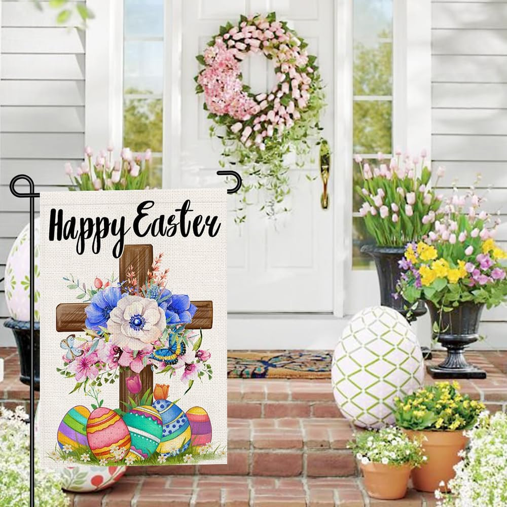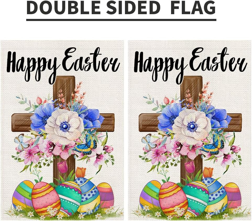 Happy Easter Garden Flag Burlap 12X18 Inch Double Sided Outside, Christian Relig