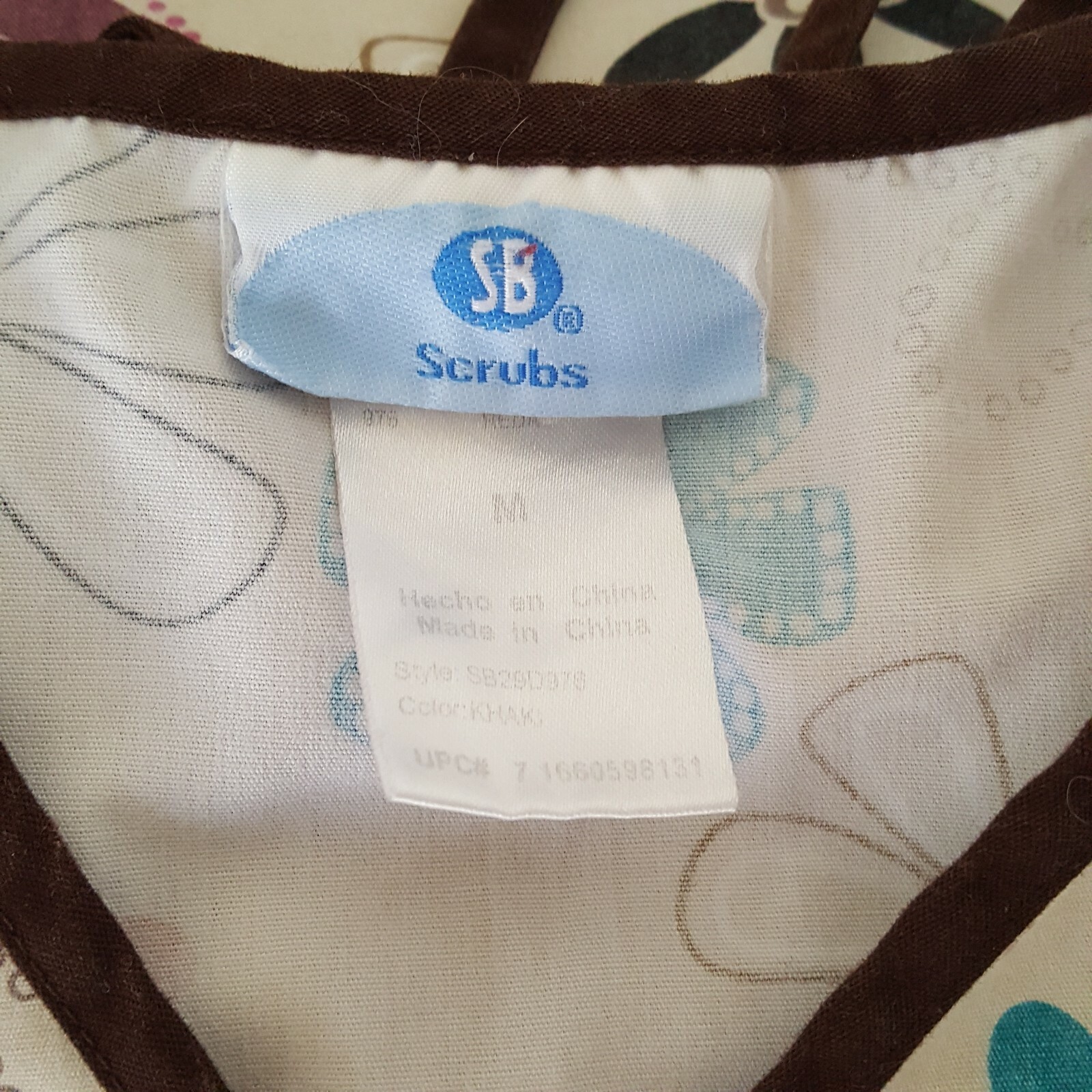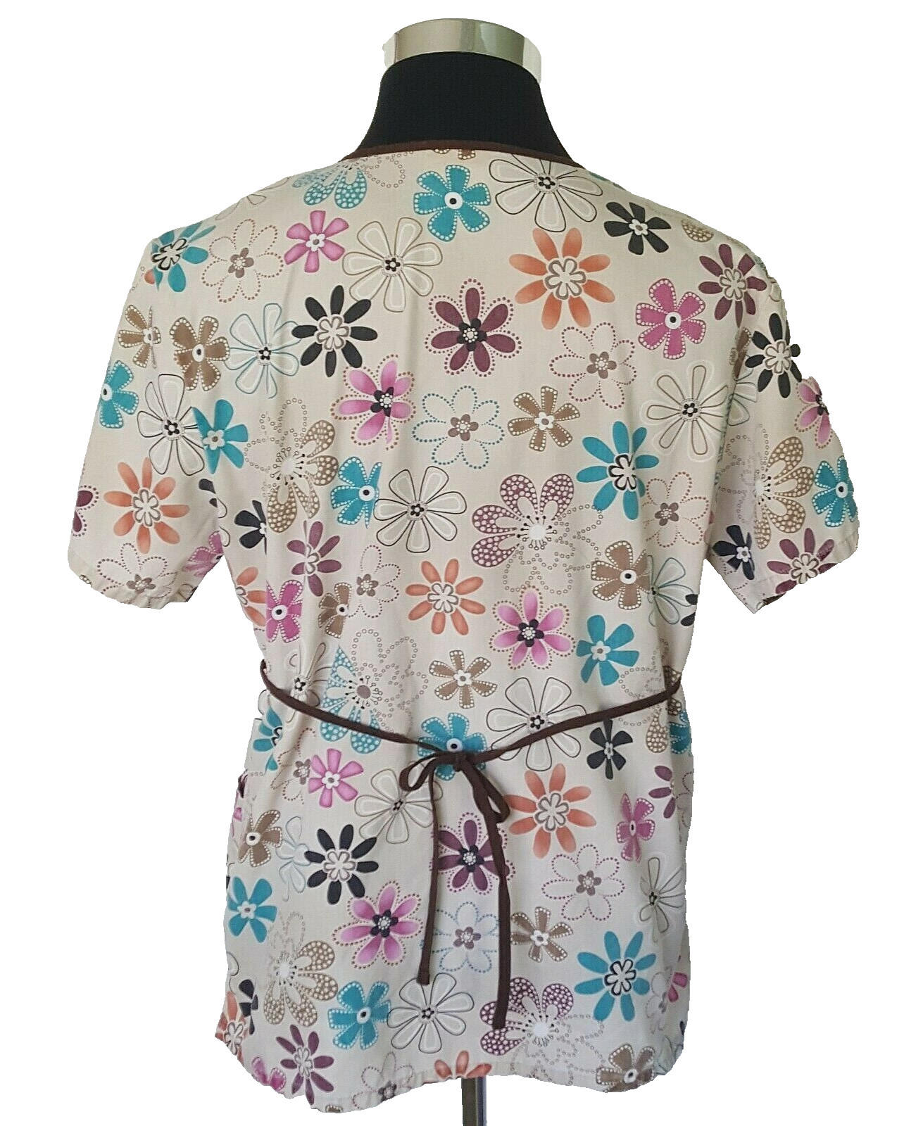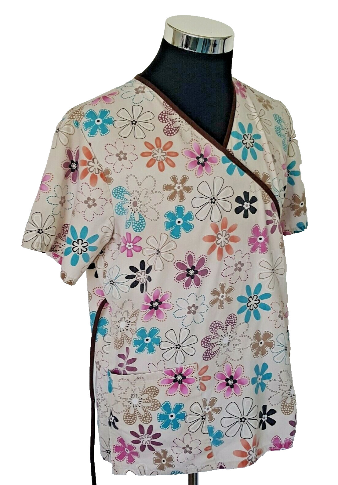 как выглядит SB Scrubs Top Womens Size Medium Multicolor Floral/Beige Short Sleeves Ties фото