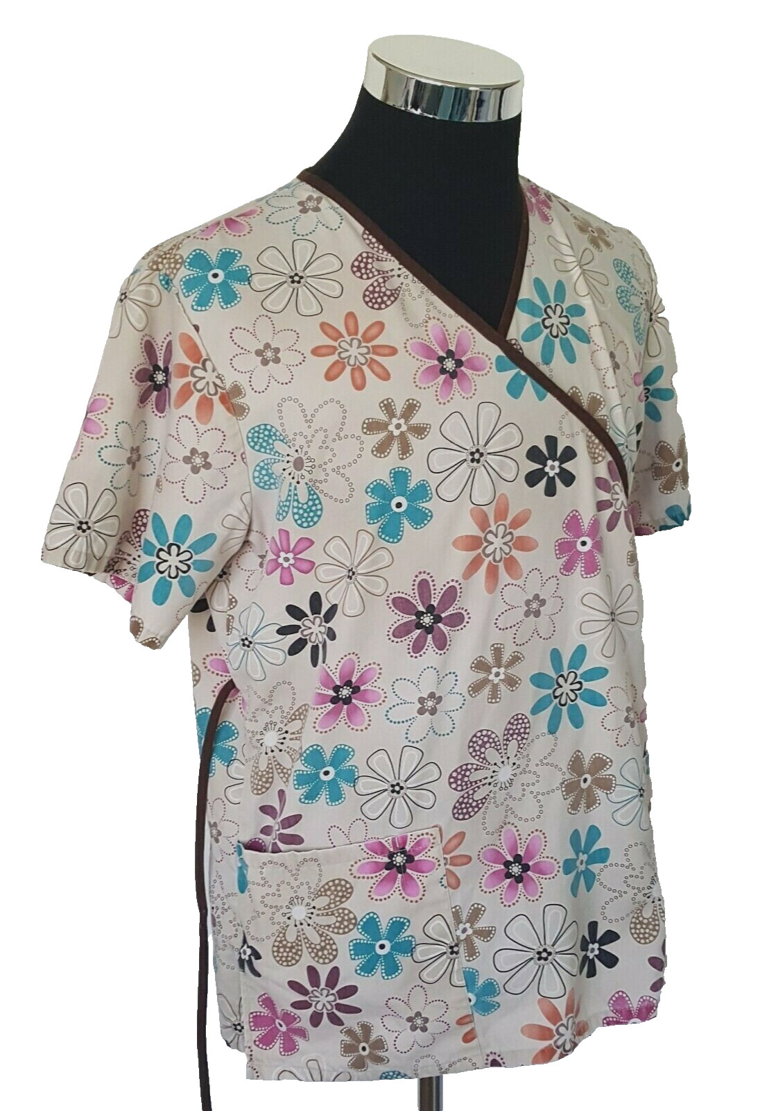 SB Scrubs Top Women's Size Medium Multicolor Floral/Beige Short Sleeves Ties