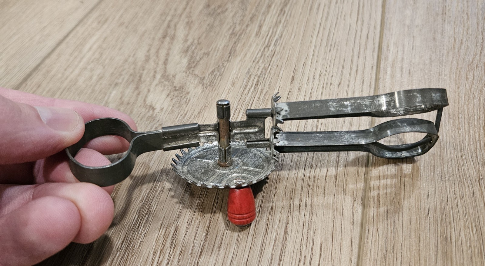 • Vintage Betty Taplin Mini Egg Beater Metal Toy with Red Wooden Handle