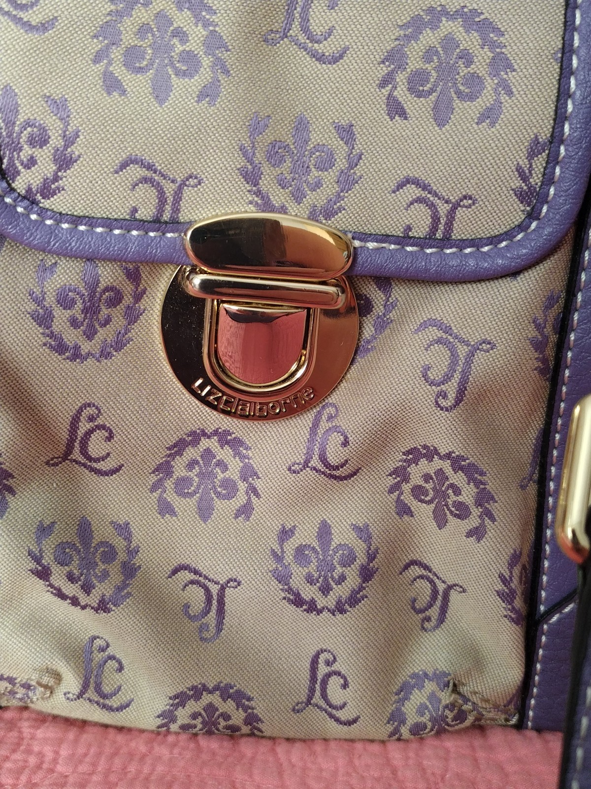 как выглядит Vintage Womens Liz Claiborne Leather Trim Satchel Purple Beige Geometric 12 In фото