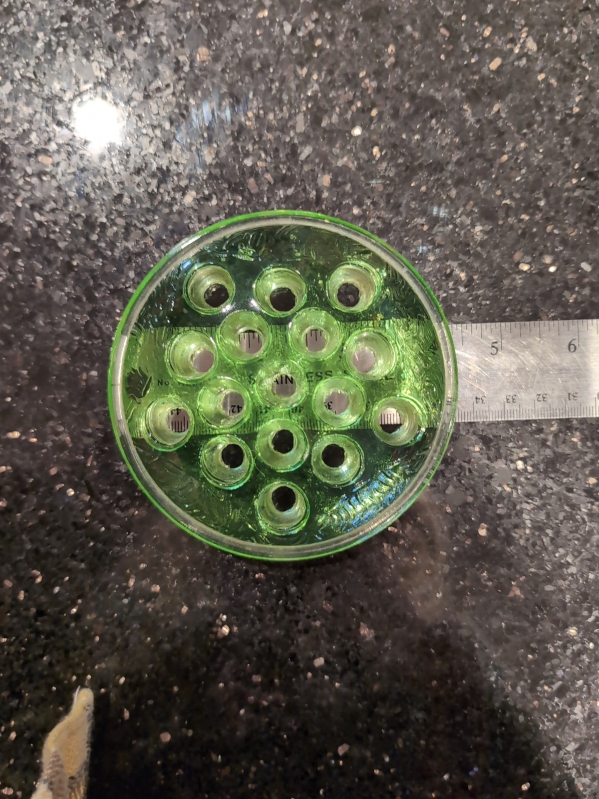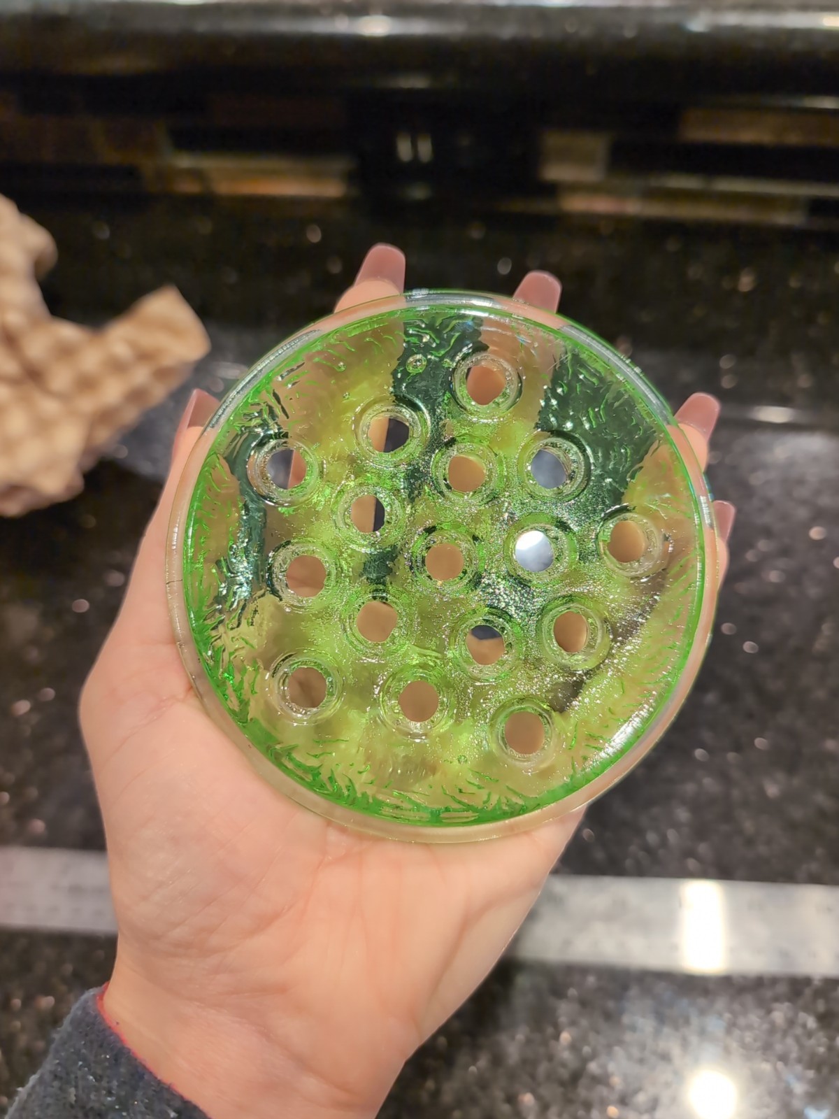vintage Depression GREEN GLASS FLOWER POSY FROG 16 Holes 4.5 Wide - 1 Chip