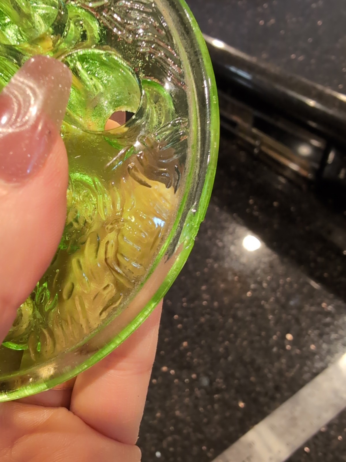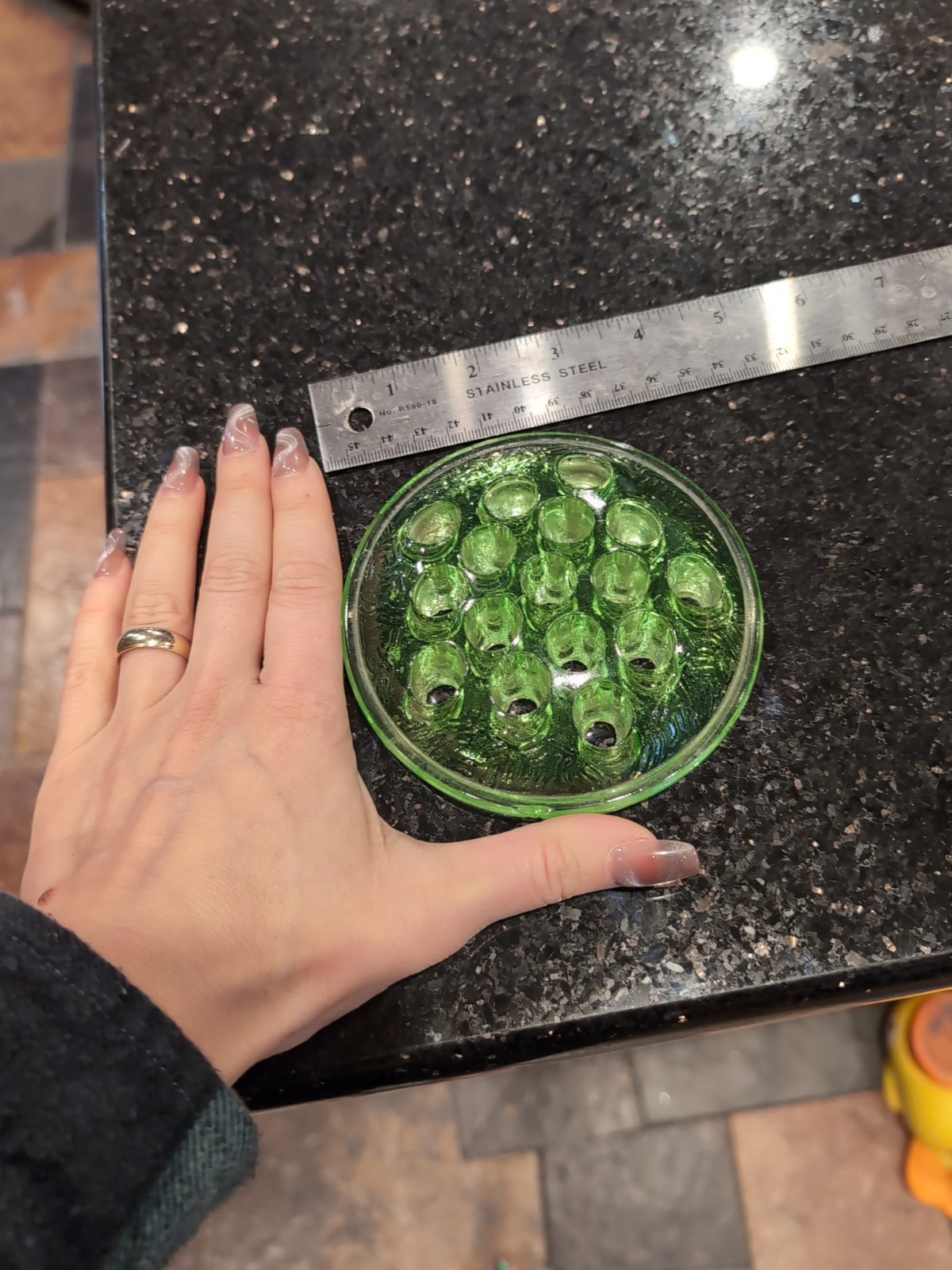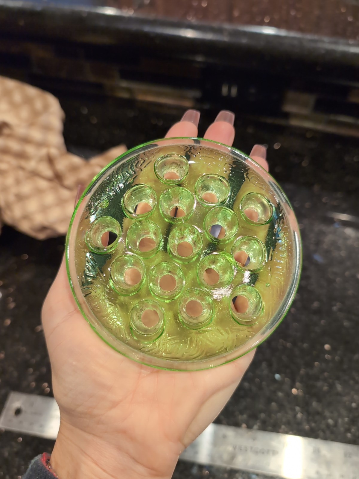 как выглядит vintage Depression GREEN GLASS FLOWER POSY FROG 16 Holes 4.5" Wide - 1 Chip фото