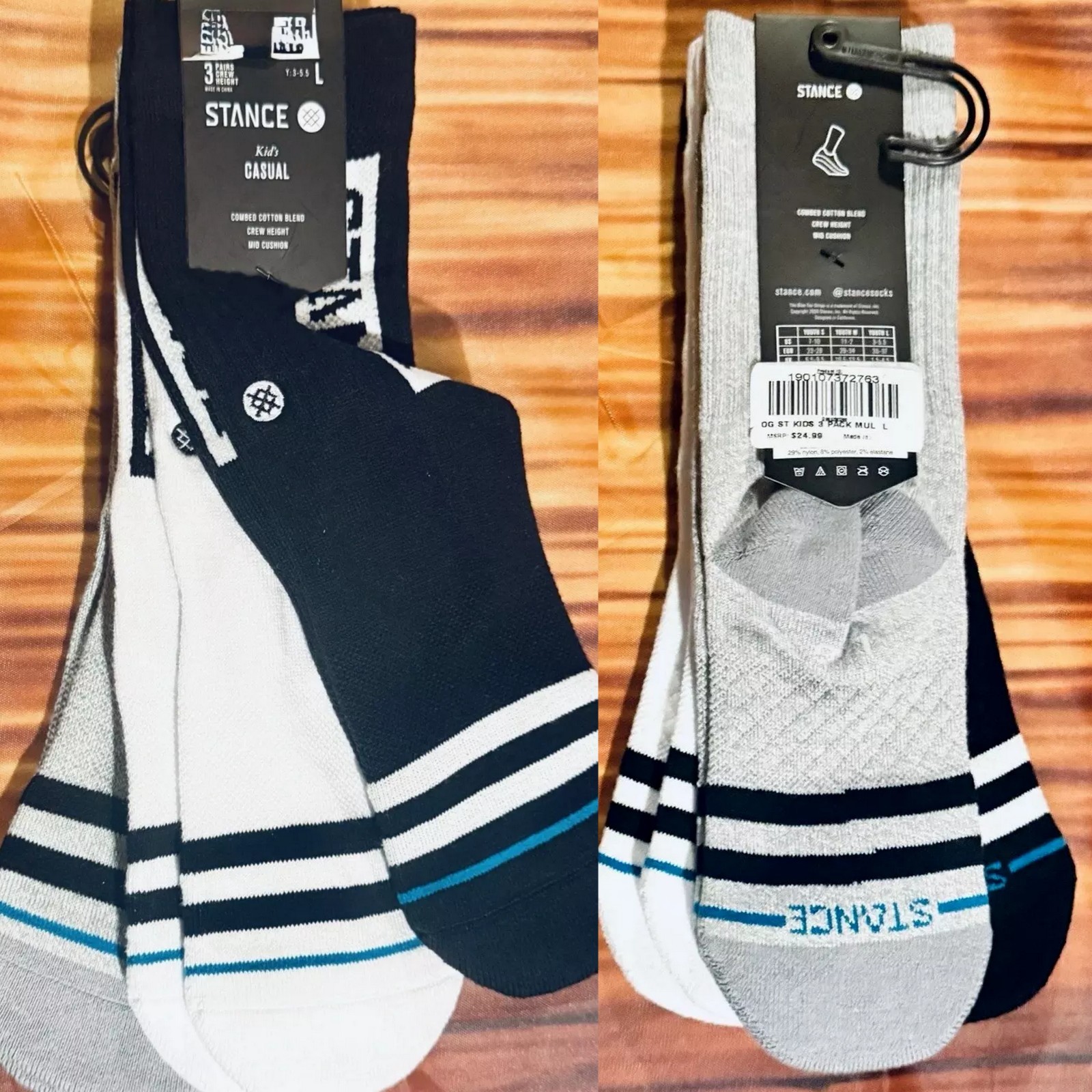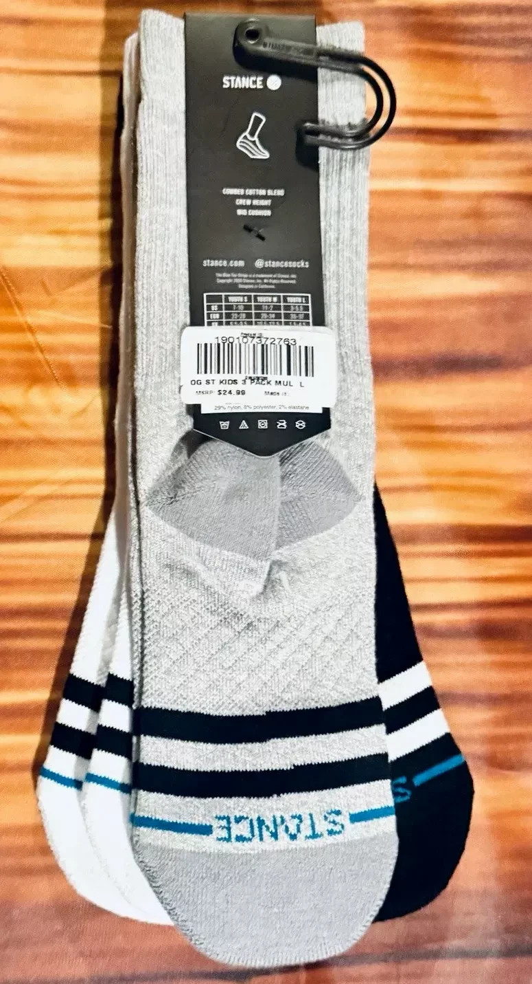 NEW Stance OG ST 3 Pack Kids Crew Length Socks blk-gray-white Yth Sz Large 3-5.5