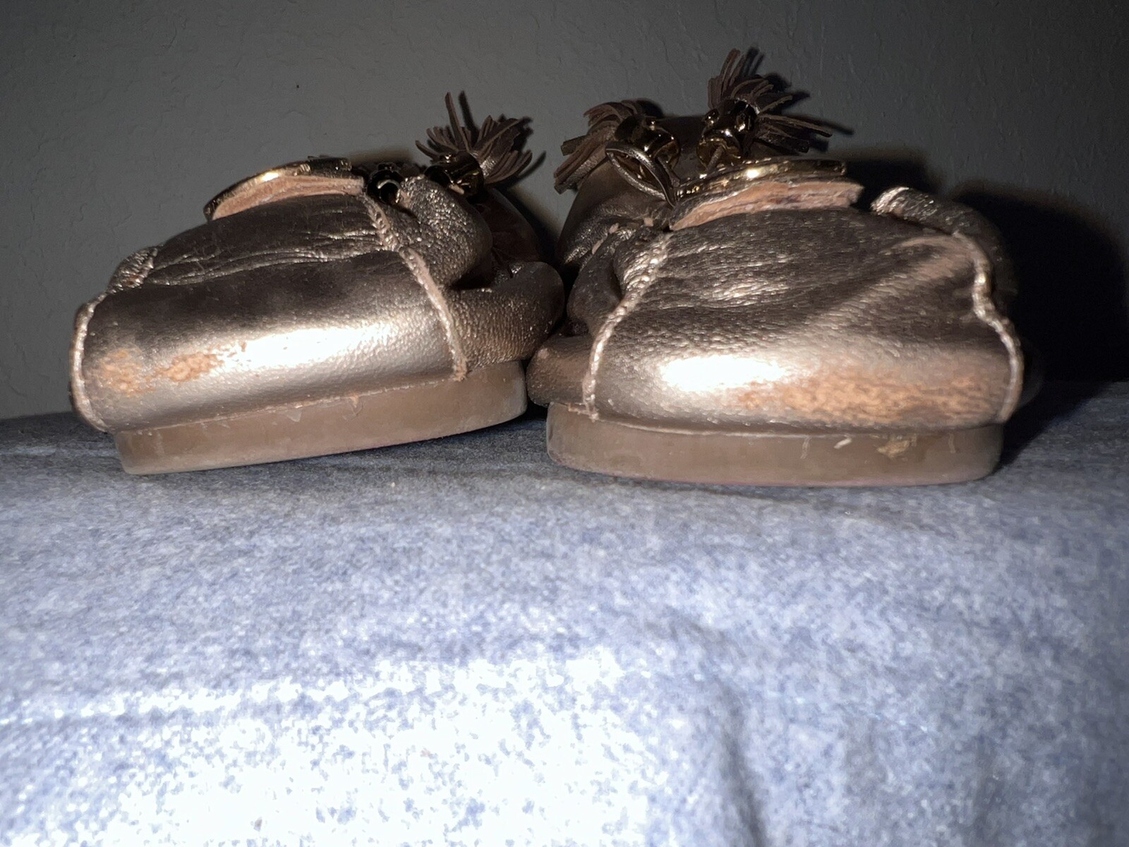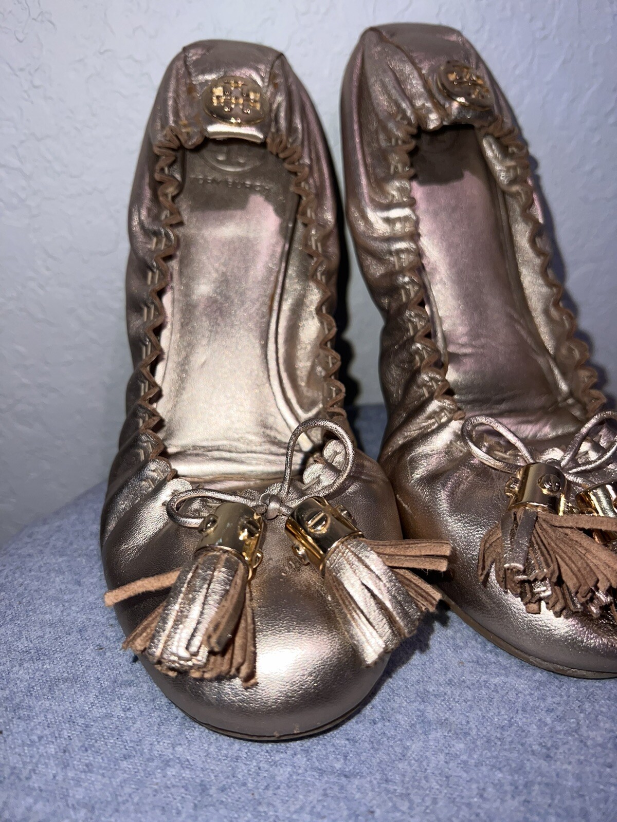 как выглядит Tory Burch Reese sz 8 GOLD Scrunch Tassel Ballet Flats фото