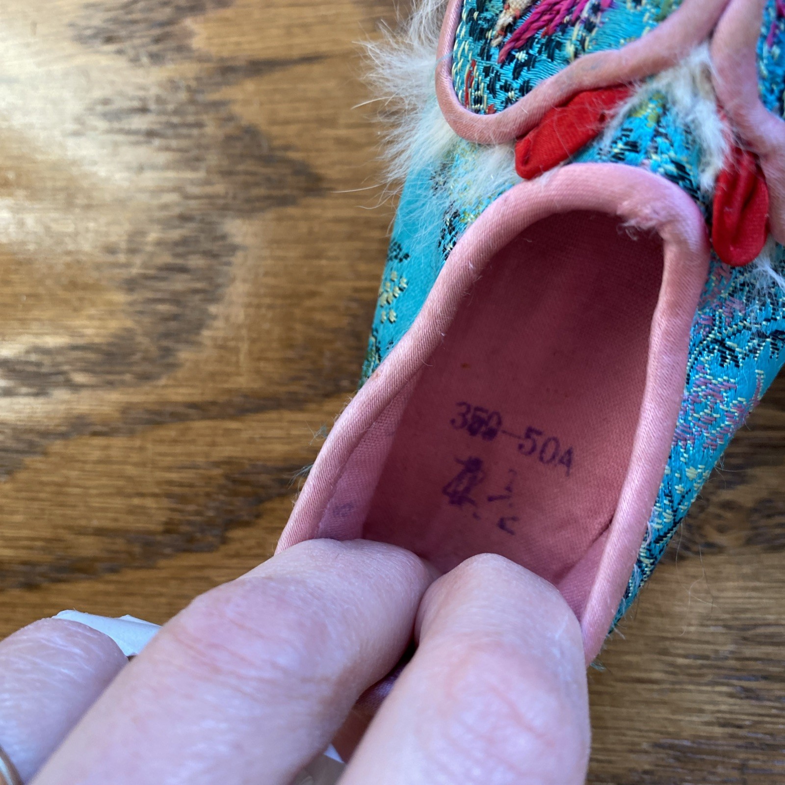 как выглядит VTG Pair Girl Toddler Chinese Dragon Slippers Satin Bells Tassels 4 1/2 фото