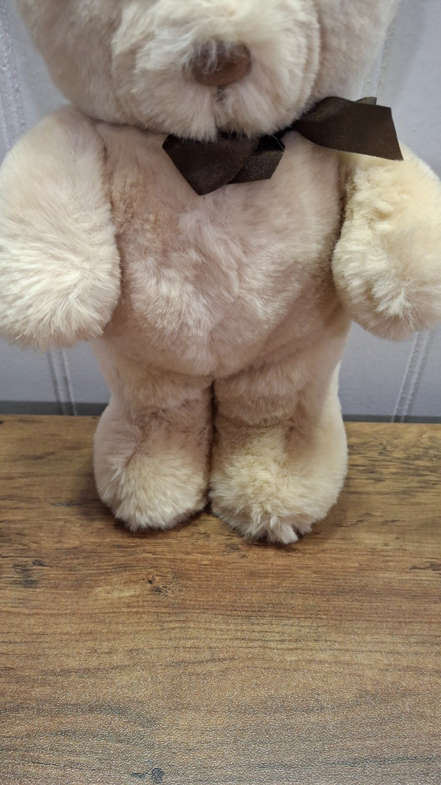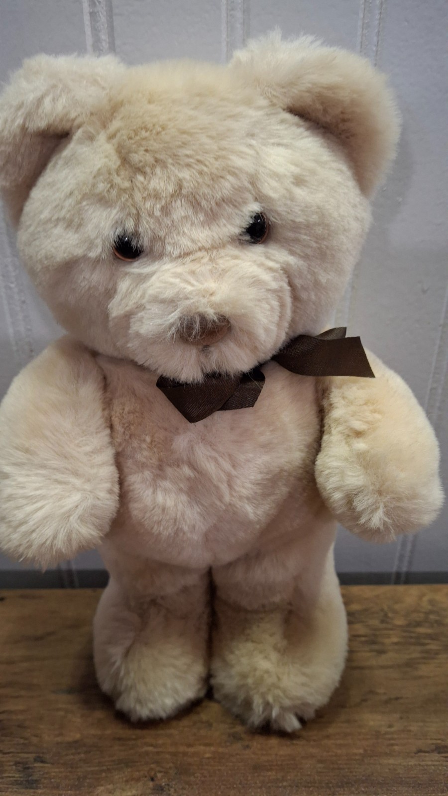 как выглядит Vintage 1984 Dakin Plush Teddy Bear Light Tan Color Dark Brown Bow фото