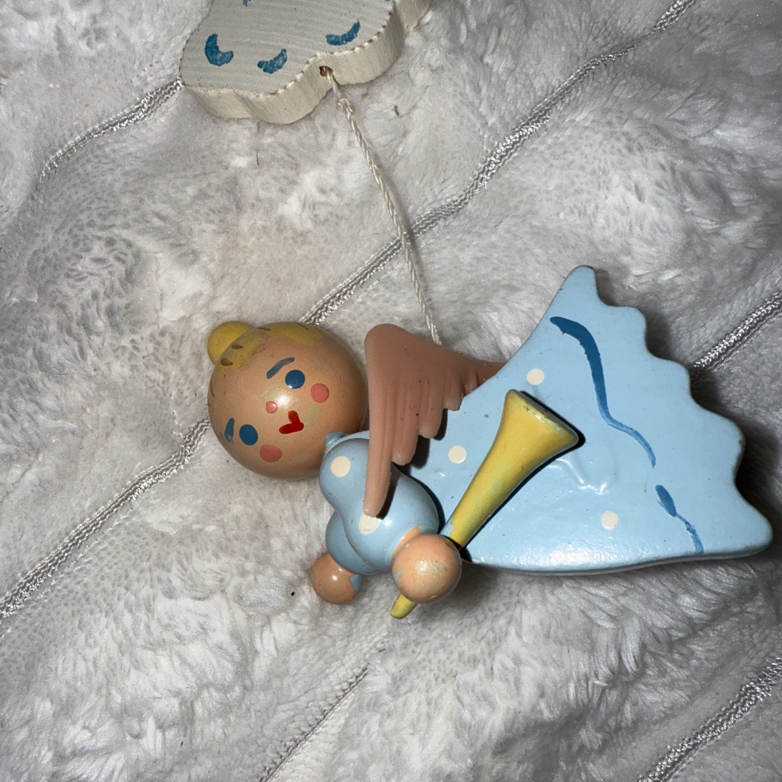как выглядит Vintage IRMI Angels Hand Painted Baby Crib Mobile Wood Pink Blue Music Box фото