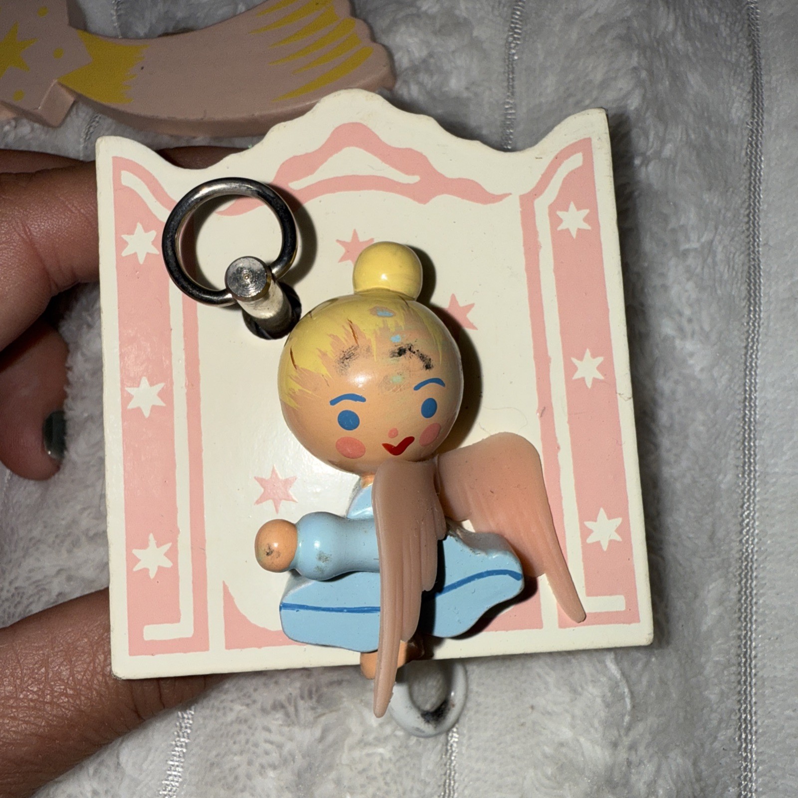 Vintage IRMI Angels Hand Painted Baby Crib Mobile Wood Pink Blue Music Box