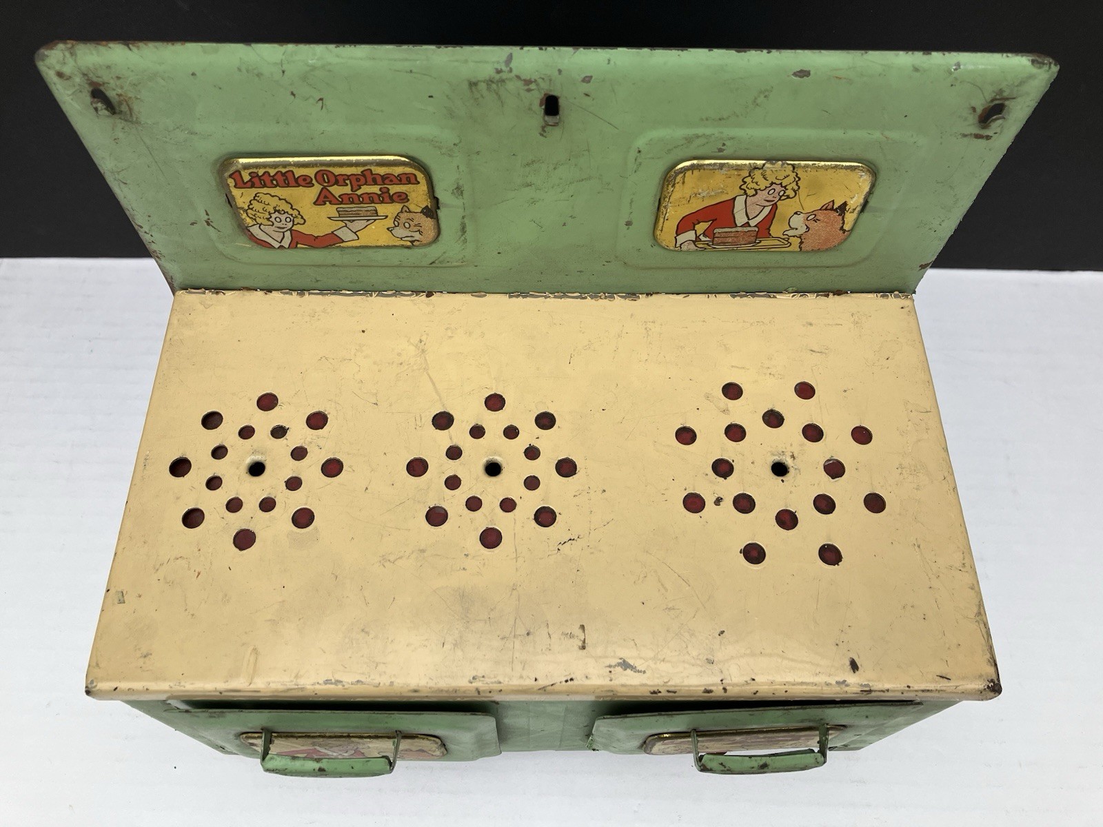 Antique 1930's Little Orphan Annie Green Toy Tin Kitchen Stove Non-Electric
