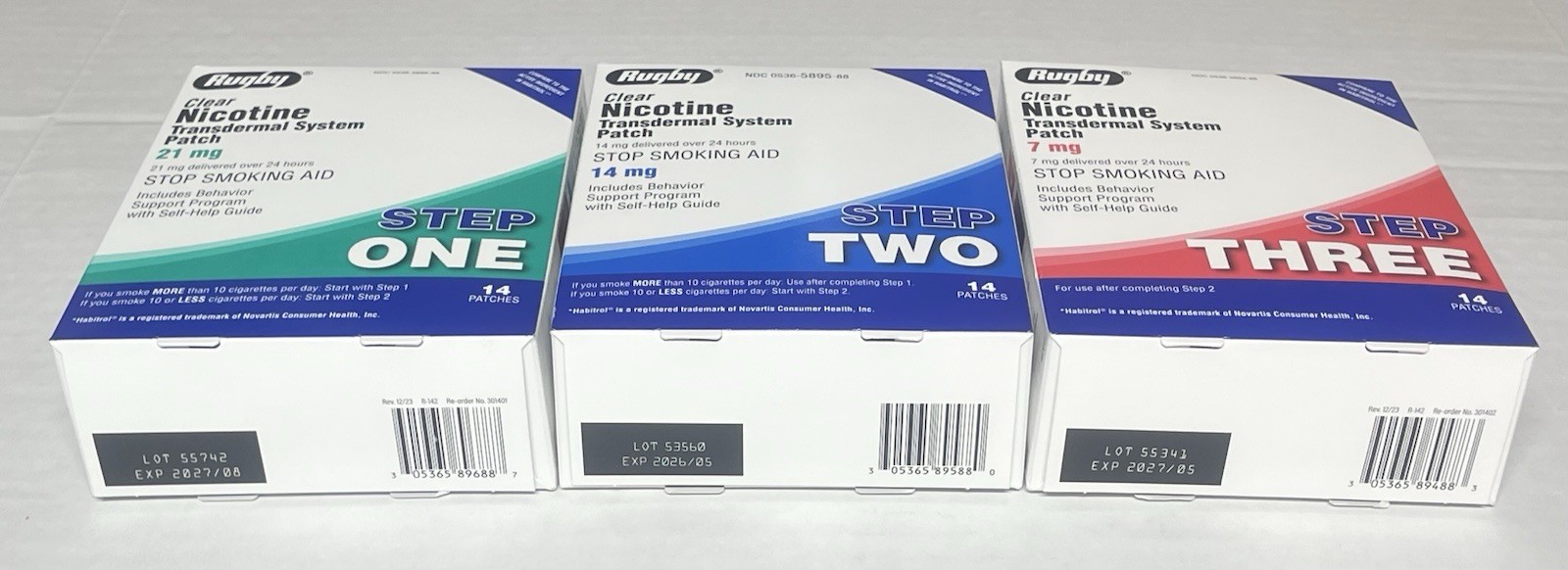 Rugby Clear Nicotine Patch. Steps One 21mg , Two 14mg , Three 7mg .