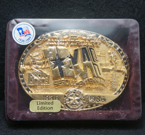 XD01163 NOS VINTAGE 1986 TEXAS SESQUICENTENNIAL MENS 24K GOLD BELT BUCKLE