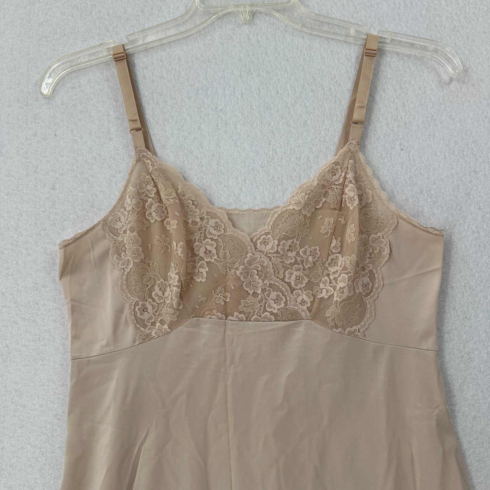как выглядит ShadowLine Floral Lace Trim Full Slip Nightgown Beige Womens 36 Tall Nylon Vtg фото