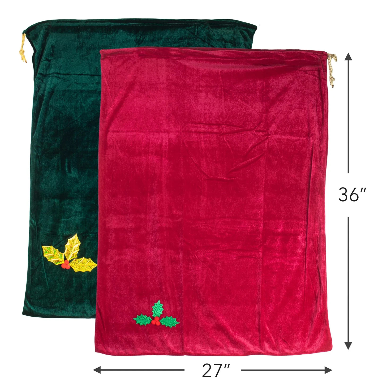 Santa Toy Bag Rich Green Velour 36 x 27 Drawstring Christmas Bag W/ Holly