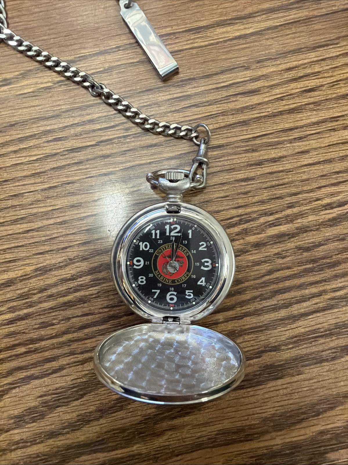 USMC United States Marine Corps Pocket Watch with Chain Needs Battery