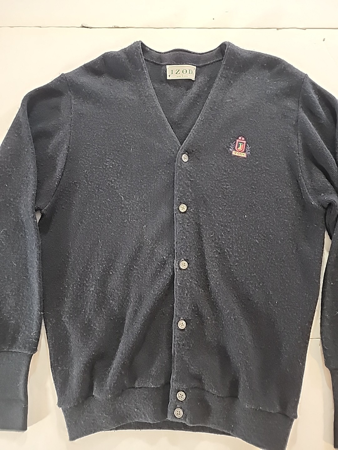 как выглядит 1980s Vintage IZOD Navy Blue Hand Knit Button Up Cardigan Mens Large USA Made фото