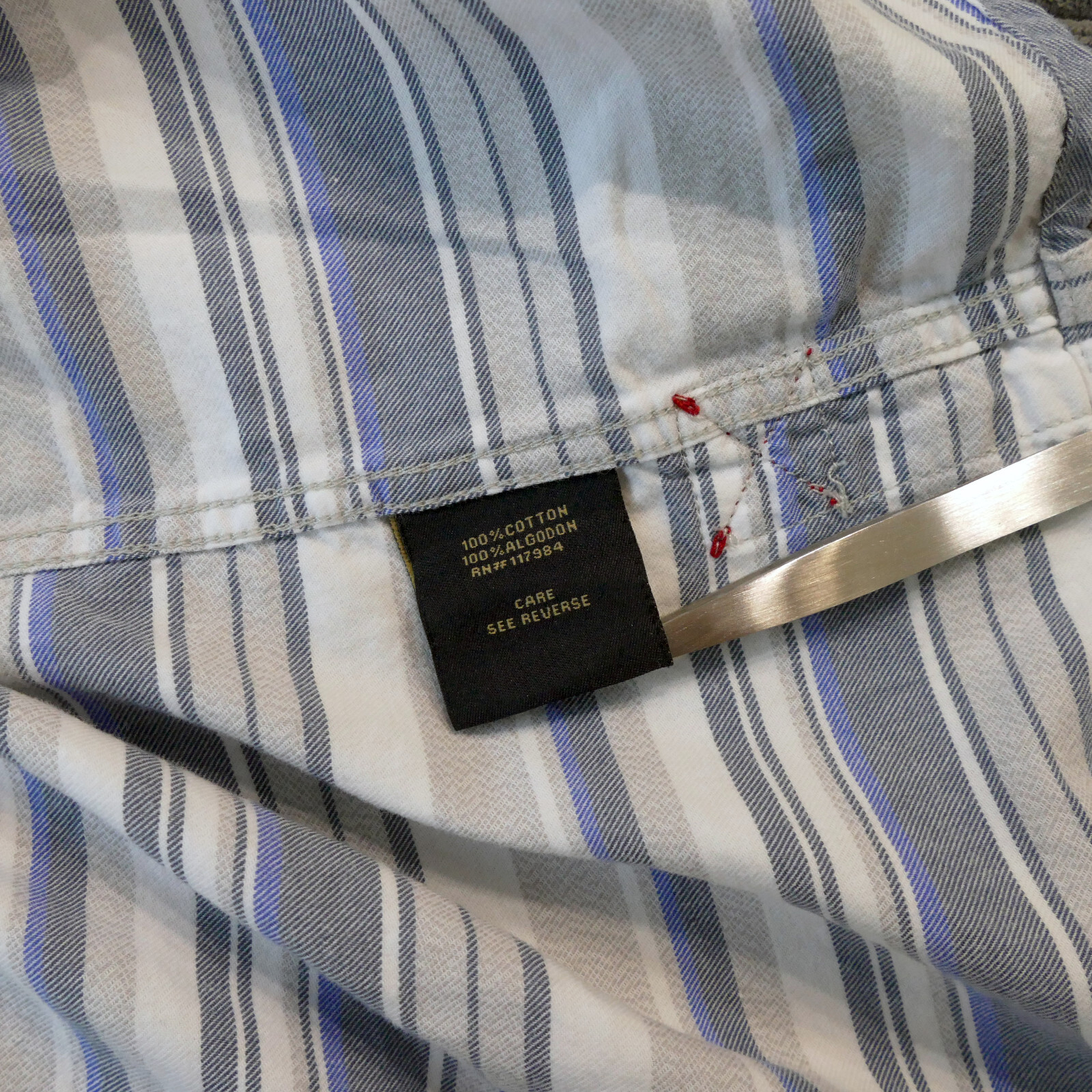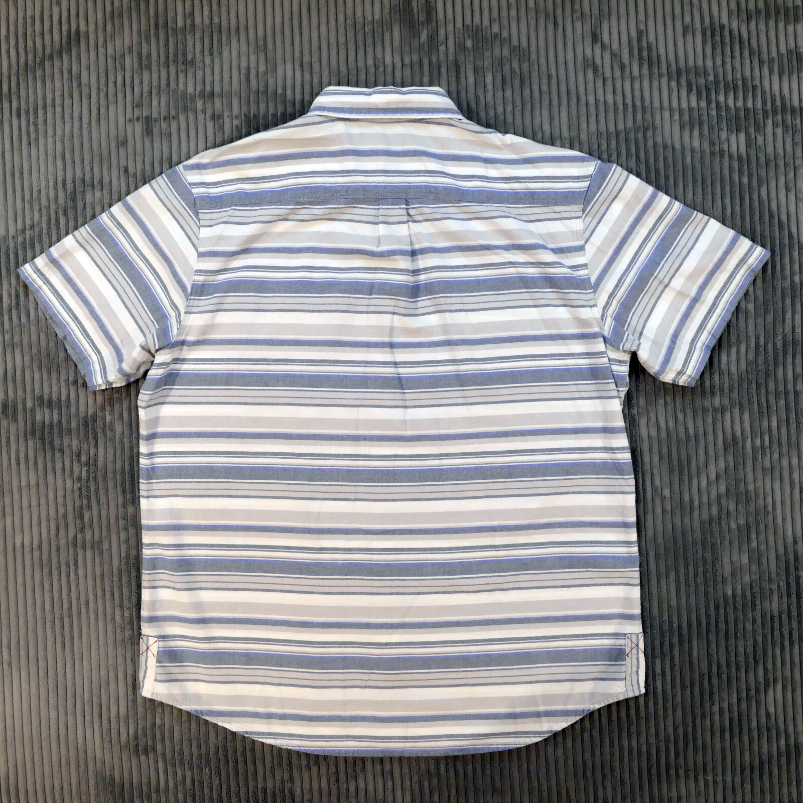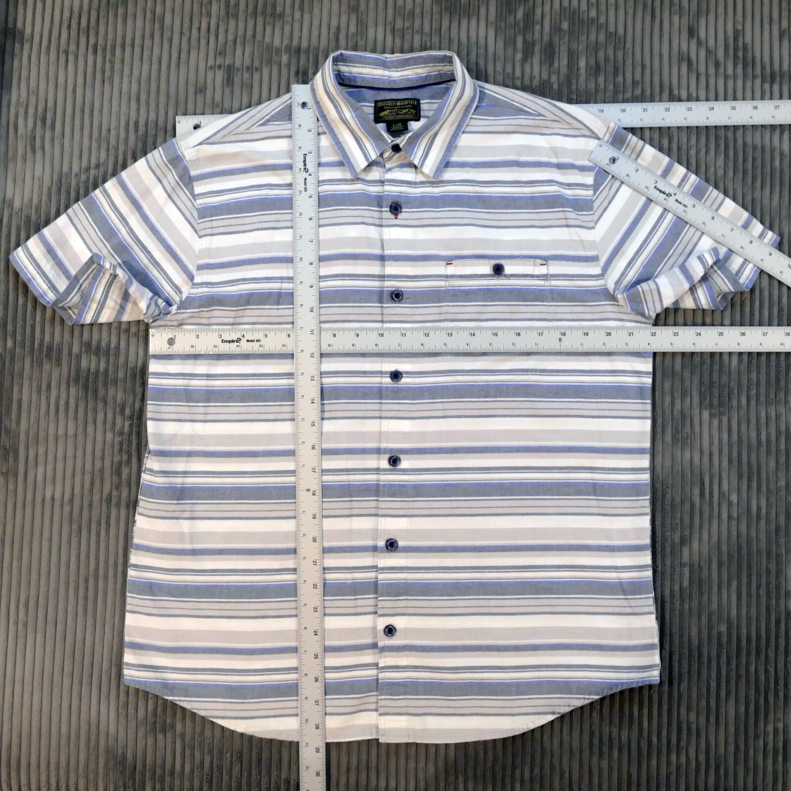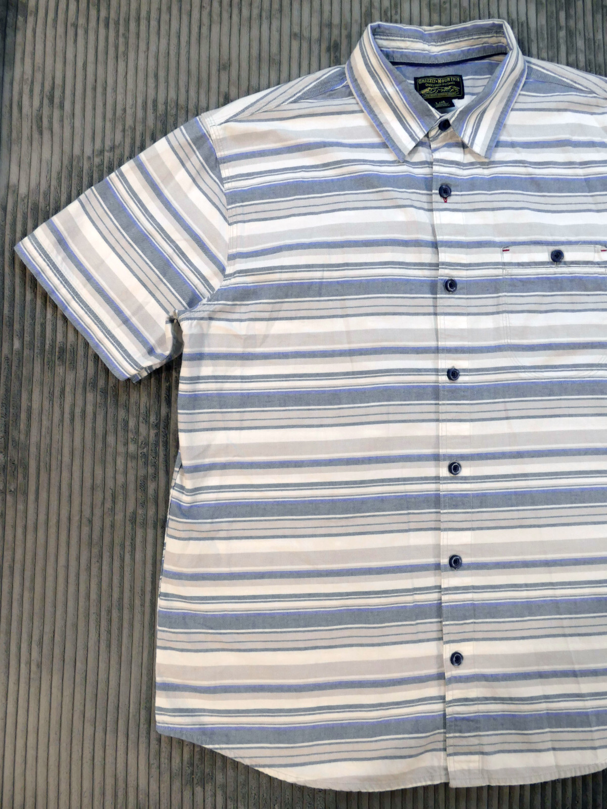 как выглядит Mens Striped Short Sleeve Shirt Large Button Up Blue Gray Beige Grizzly Mountain фото