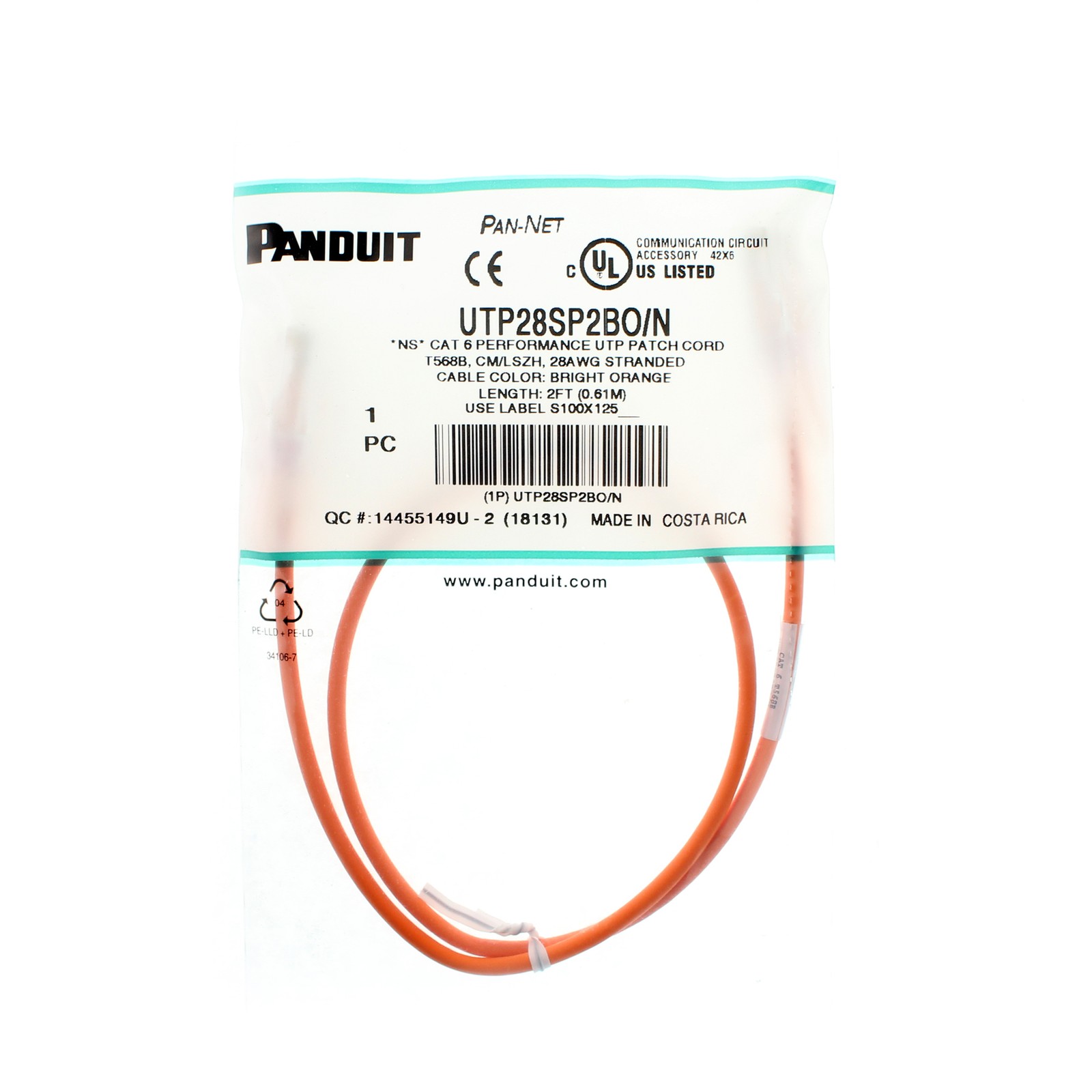 PANDUIT UTP28SP2BO/N CAT6 PERFORMANCE UTP PATCH CORD, 2-FEET, BRIGHT ORANGE