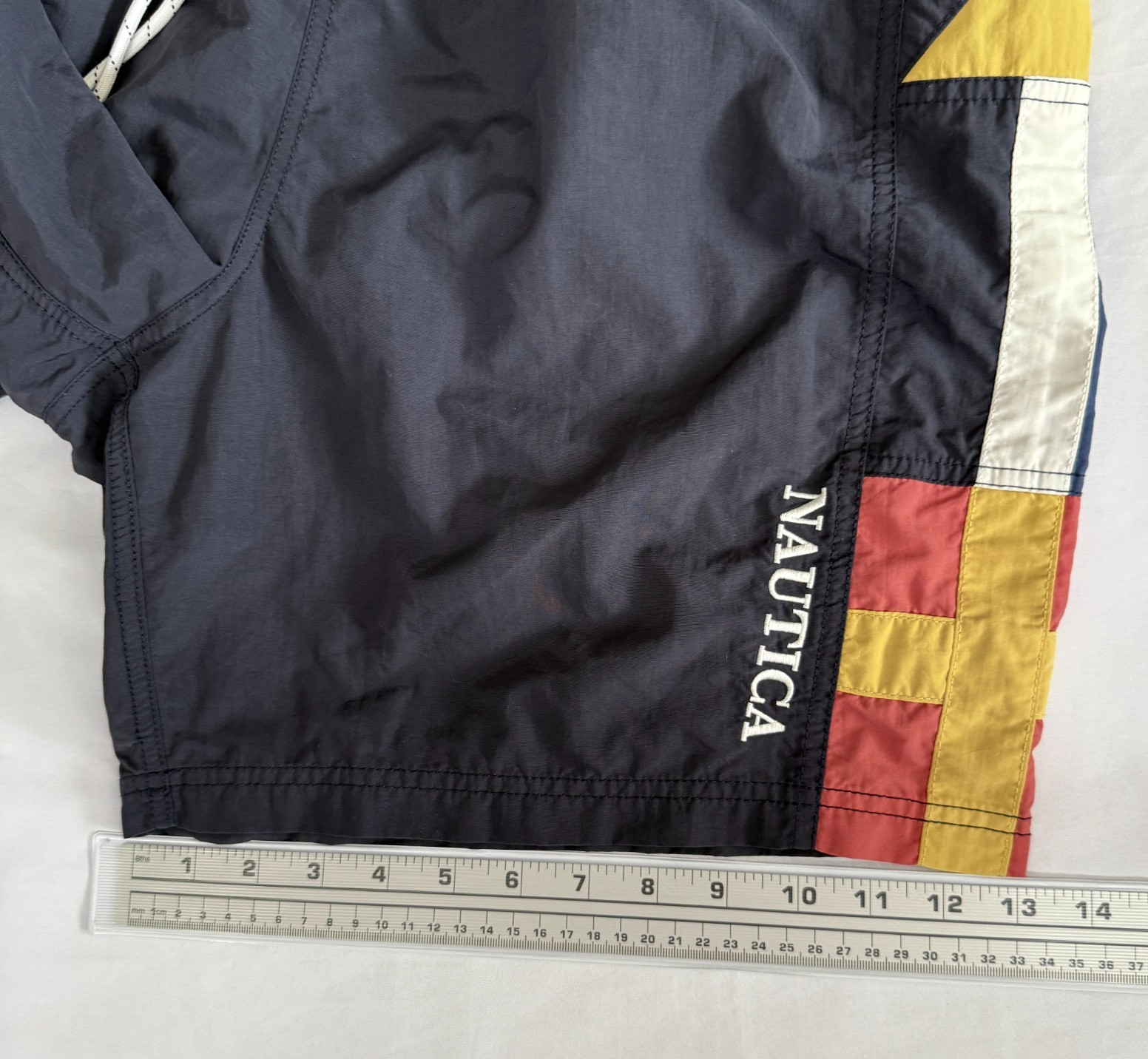 как выглядит VINTAGE NAUTICA SAILING FLAG SWIM TRUNKS MENS L NAVY BLUE RED NYLON SHORTS 7.5" фото