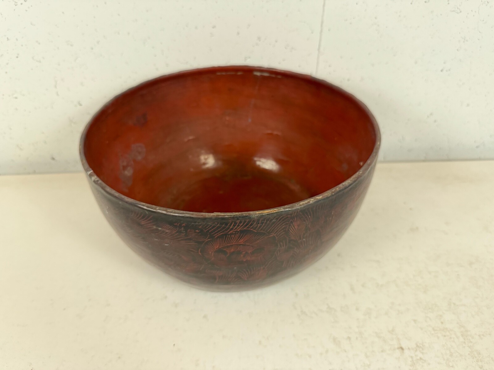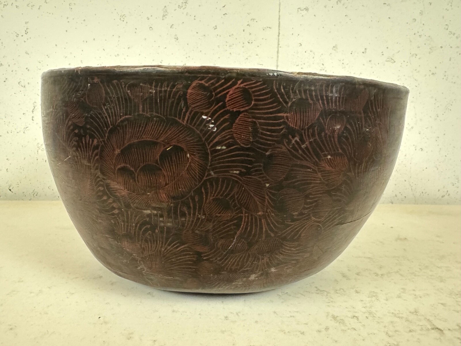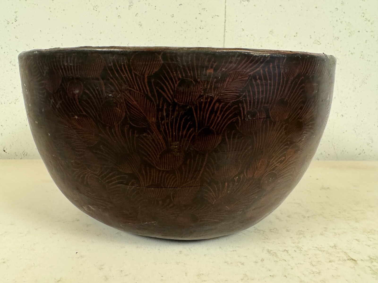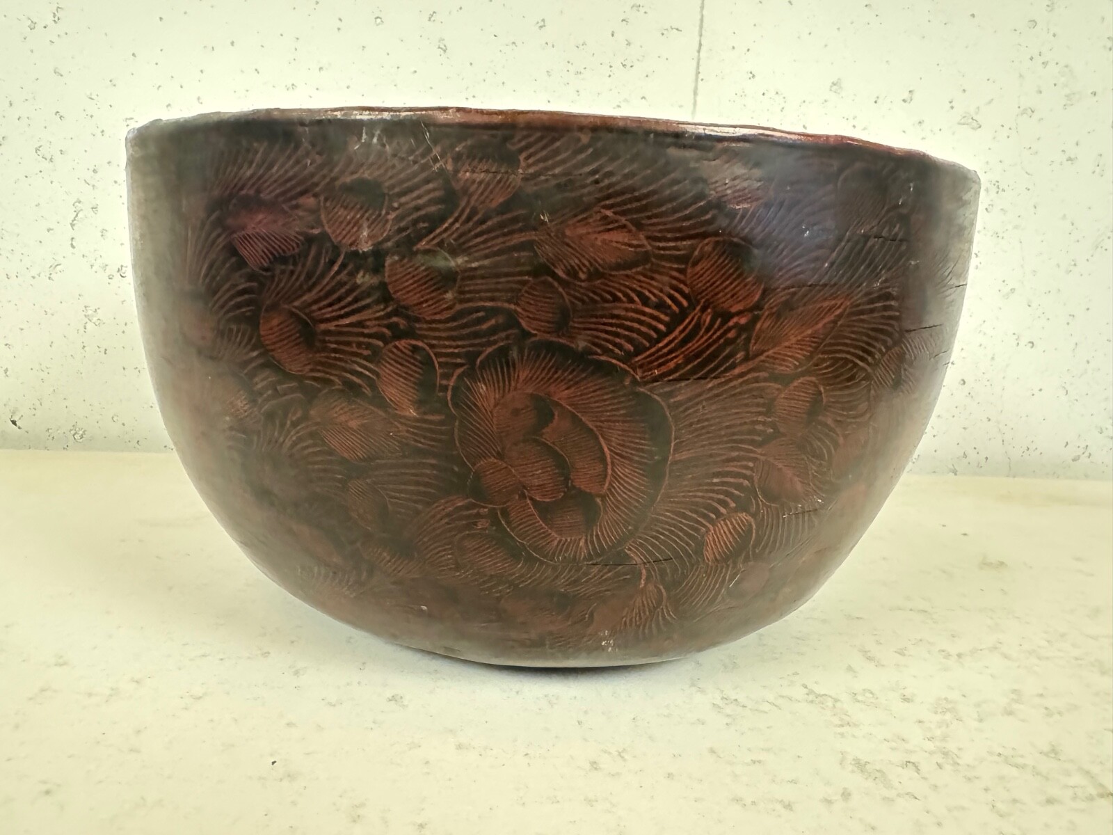 • Vintage Large Round Wooden Bowl w/ Painted Flowers Foliage Decoration