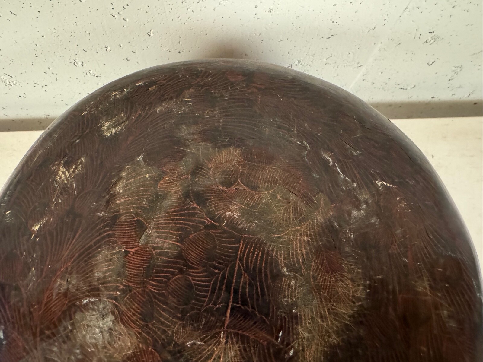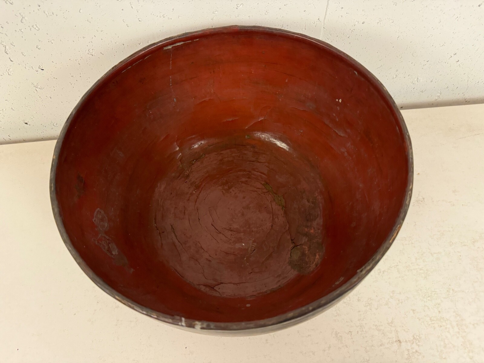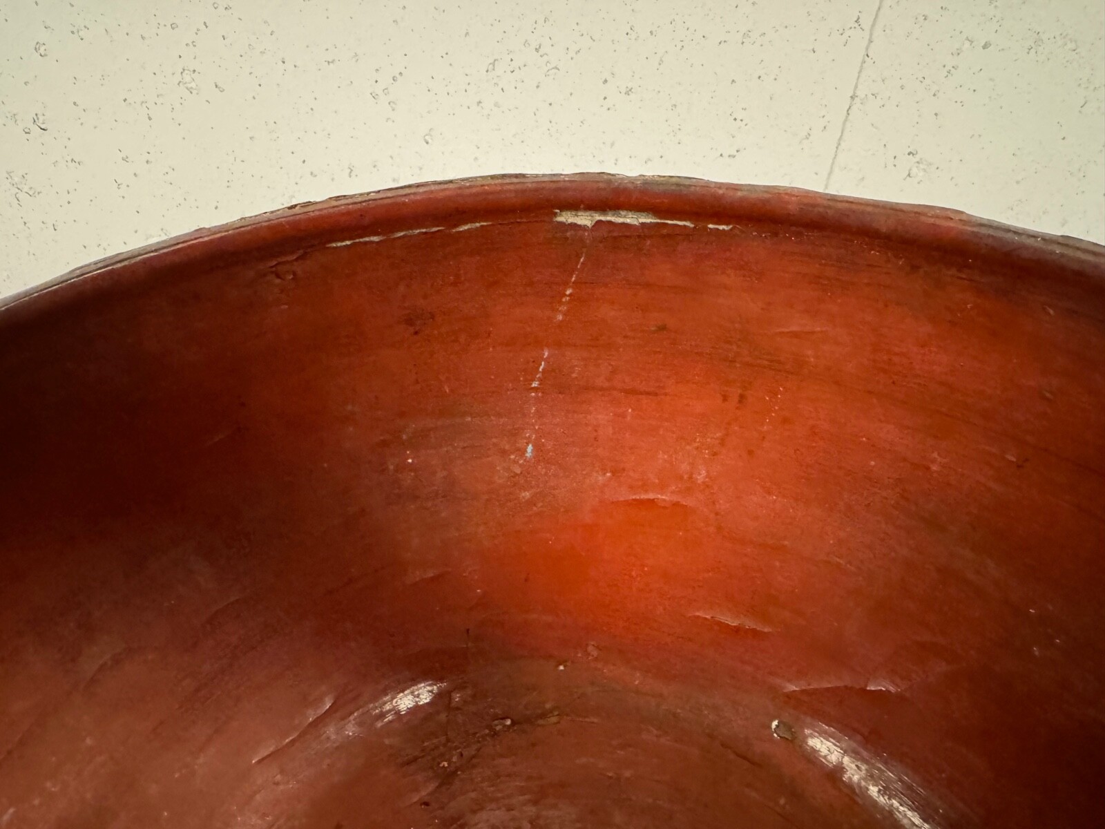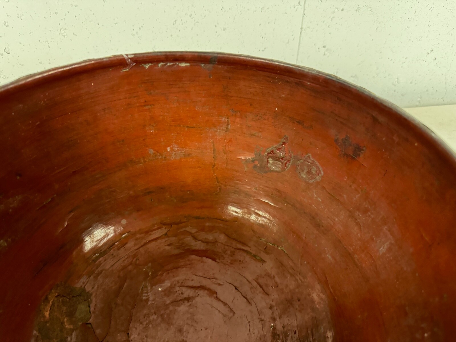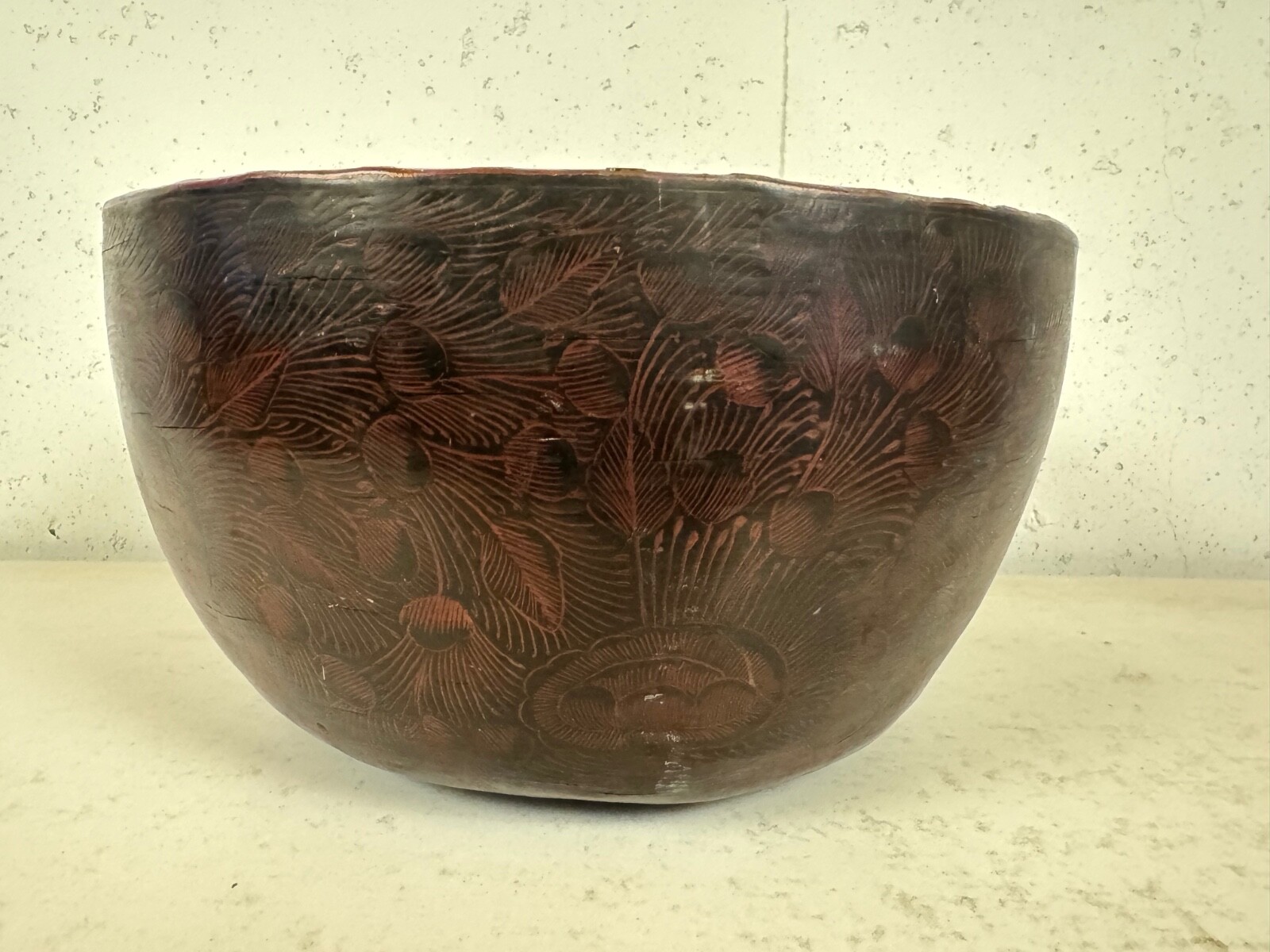 • Vintage Large Round Wooden Bowl w/ Painted Flowers Foliage Decoration