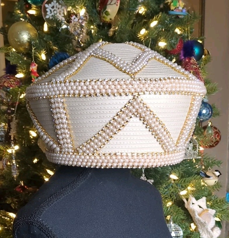 как выглядит Vintage Donna Vinci Couture Hat Beige, Pearl Rhinestone Detailing, With Box фото