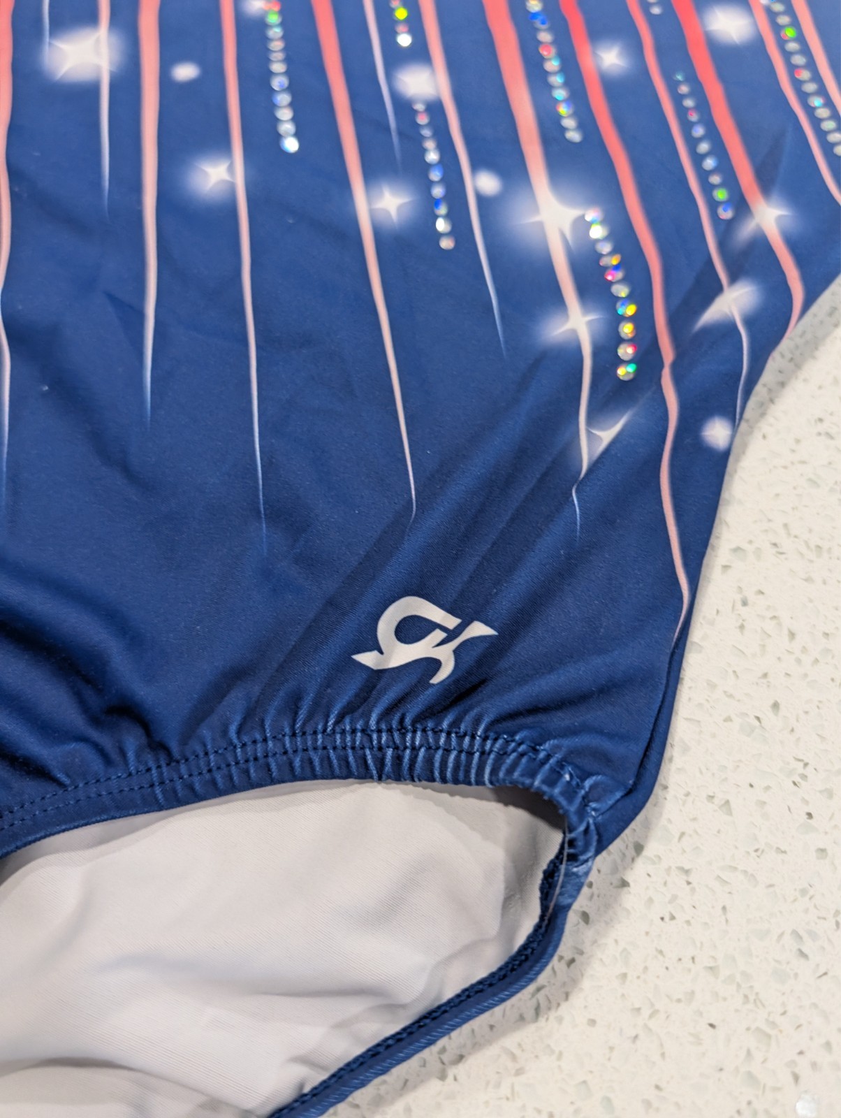 USA TEAM GK ELITE Gymnastics Dance Leotard AS Small USA PATRIOTIC Olympic RINGS