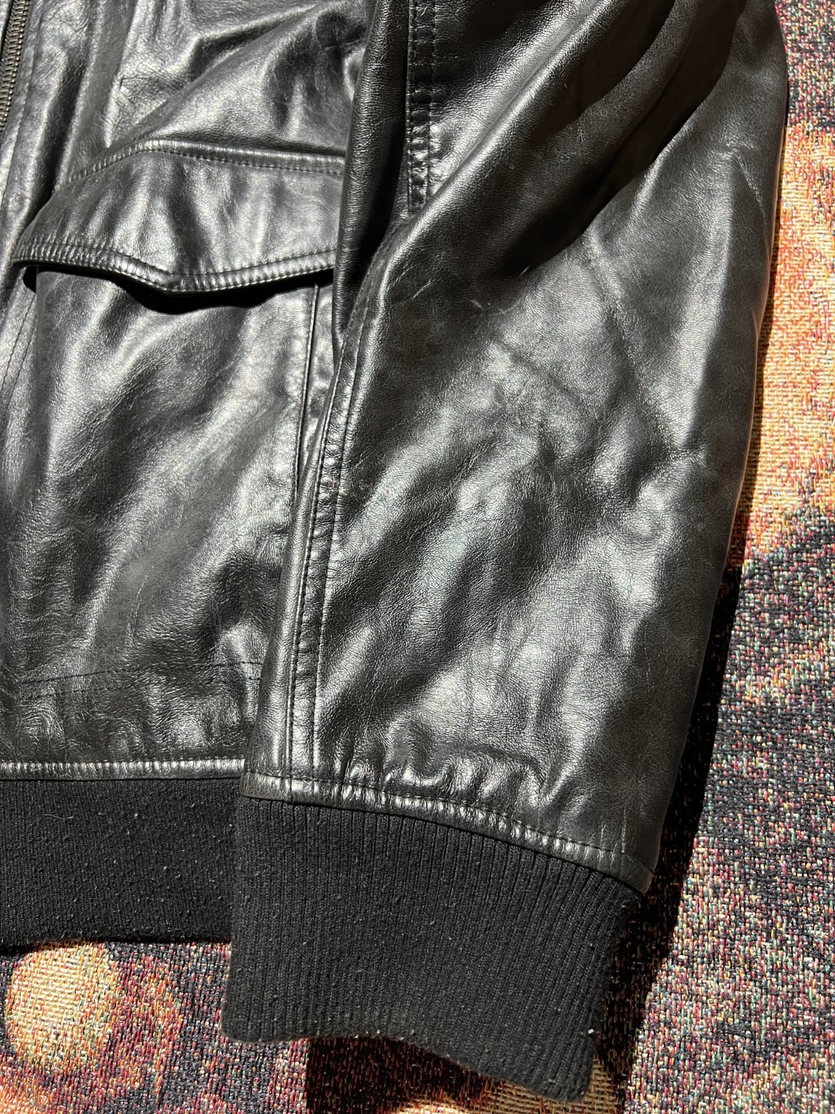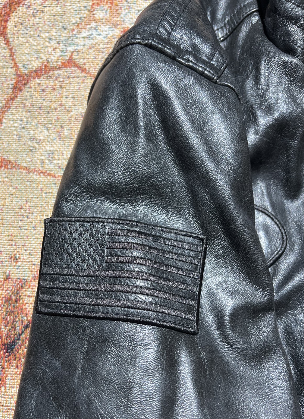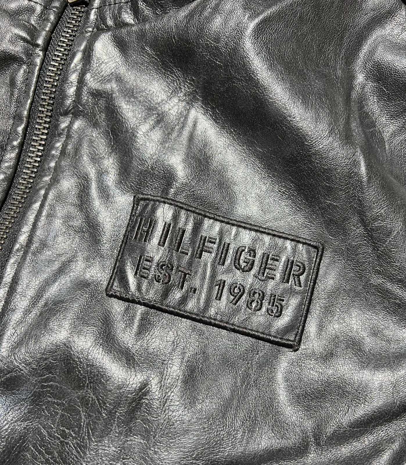 VINTAGE Tommy Hilifiger Patches Faux Leather Jacket Black Large MISSING HOOD