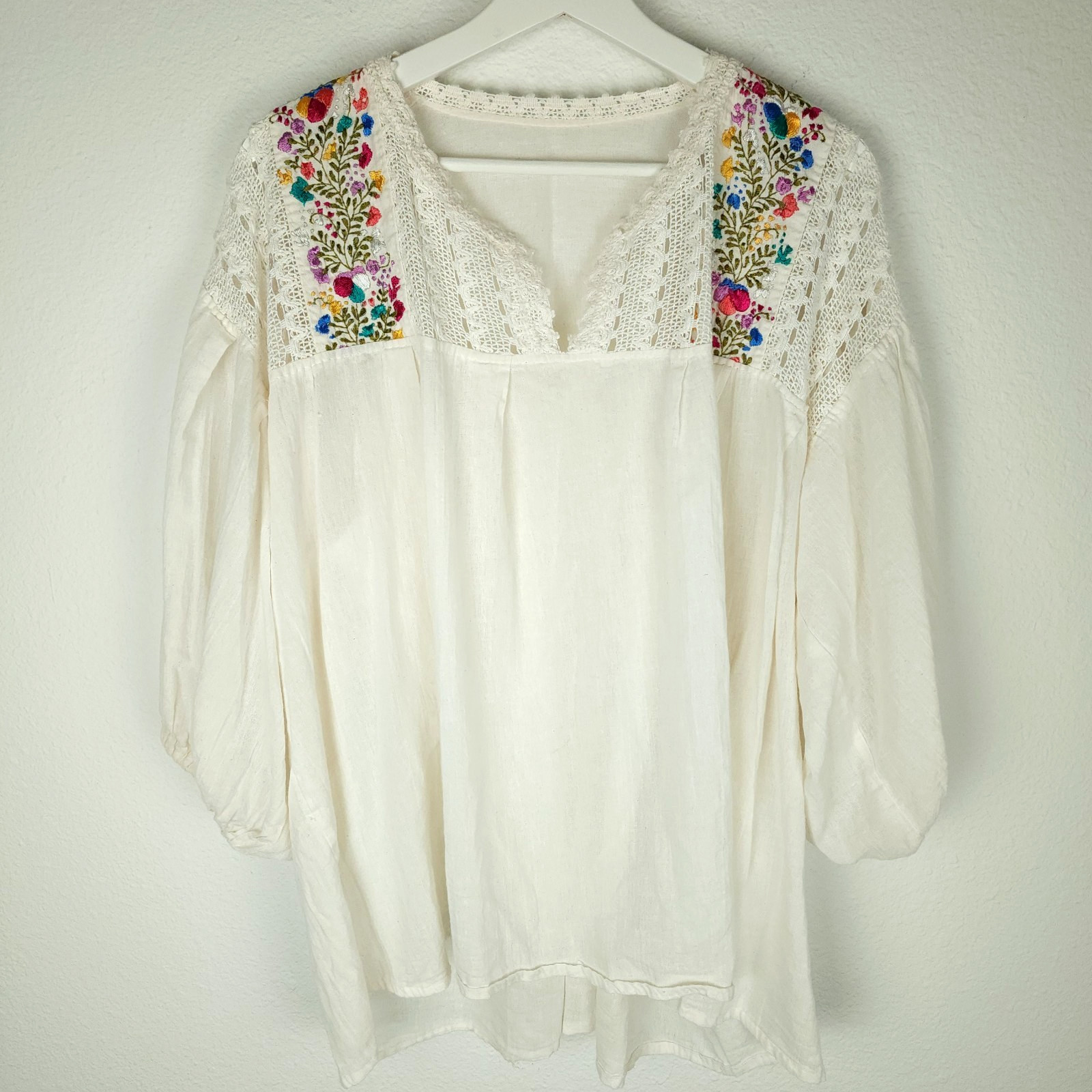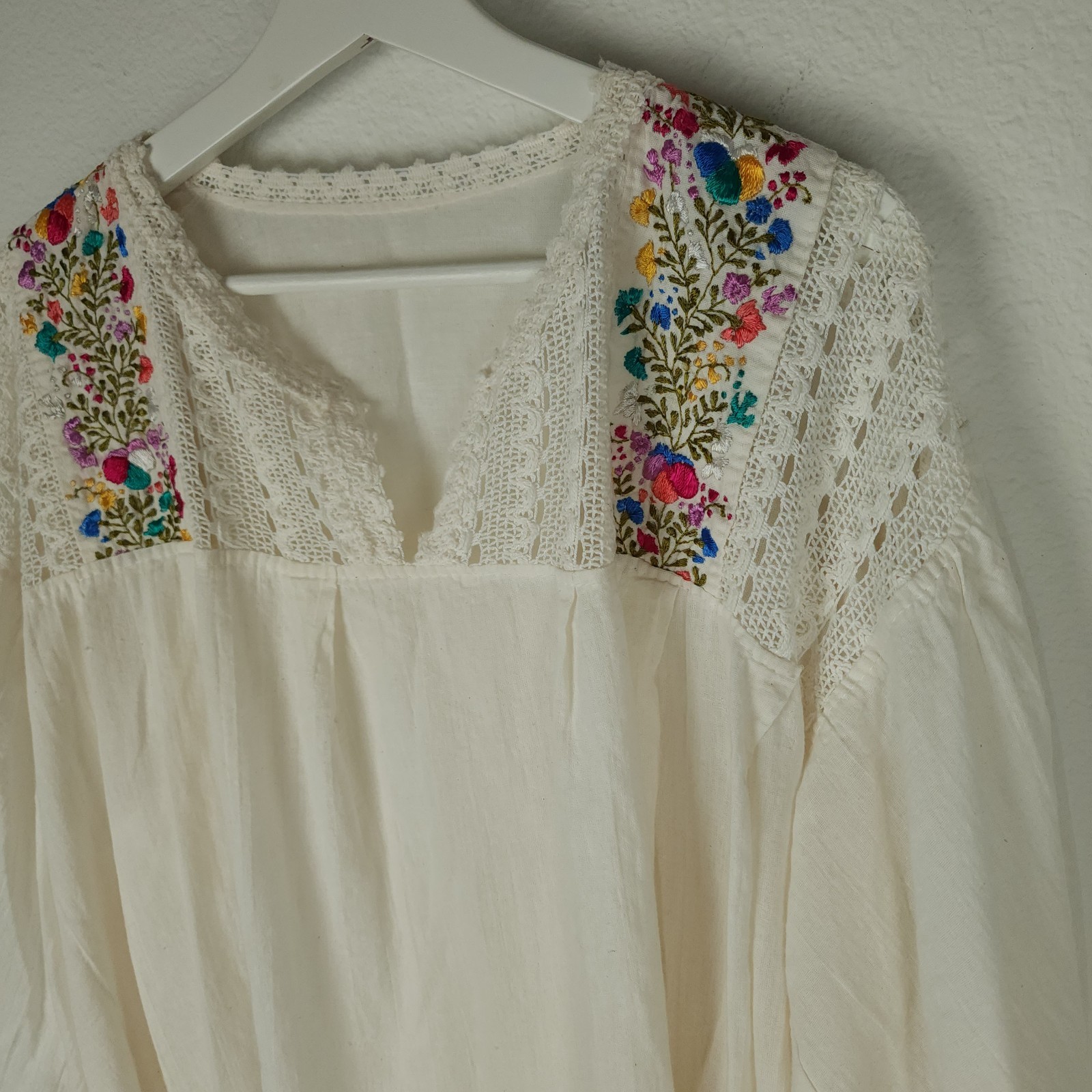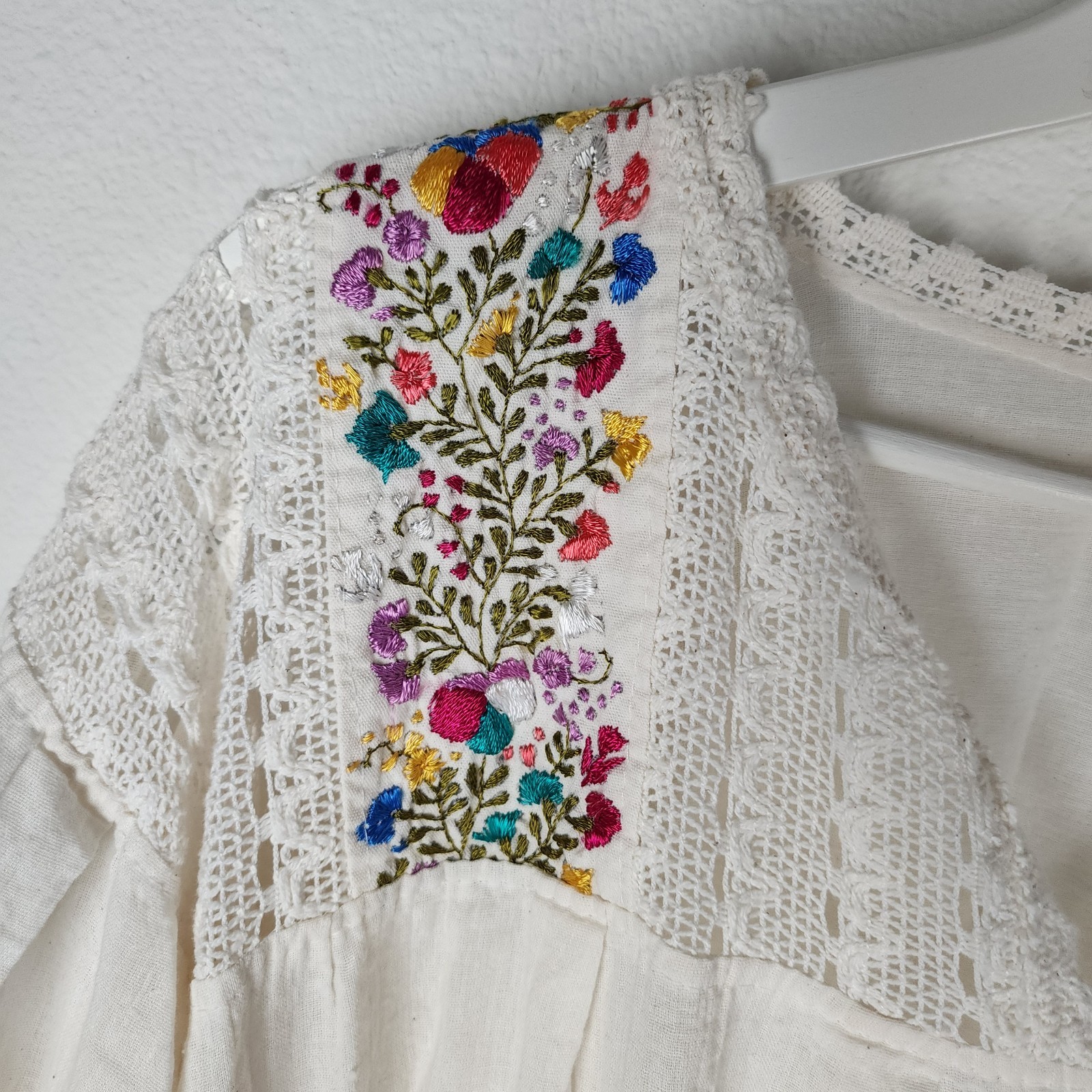 Vintage Oaxacan Mexican White Colorful Embroidery Boho Shirt Peasant Top L/XL