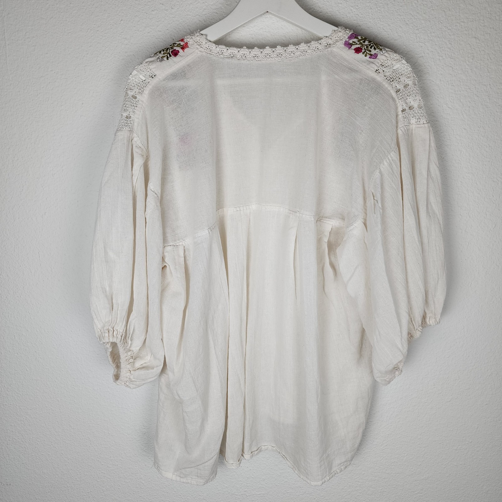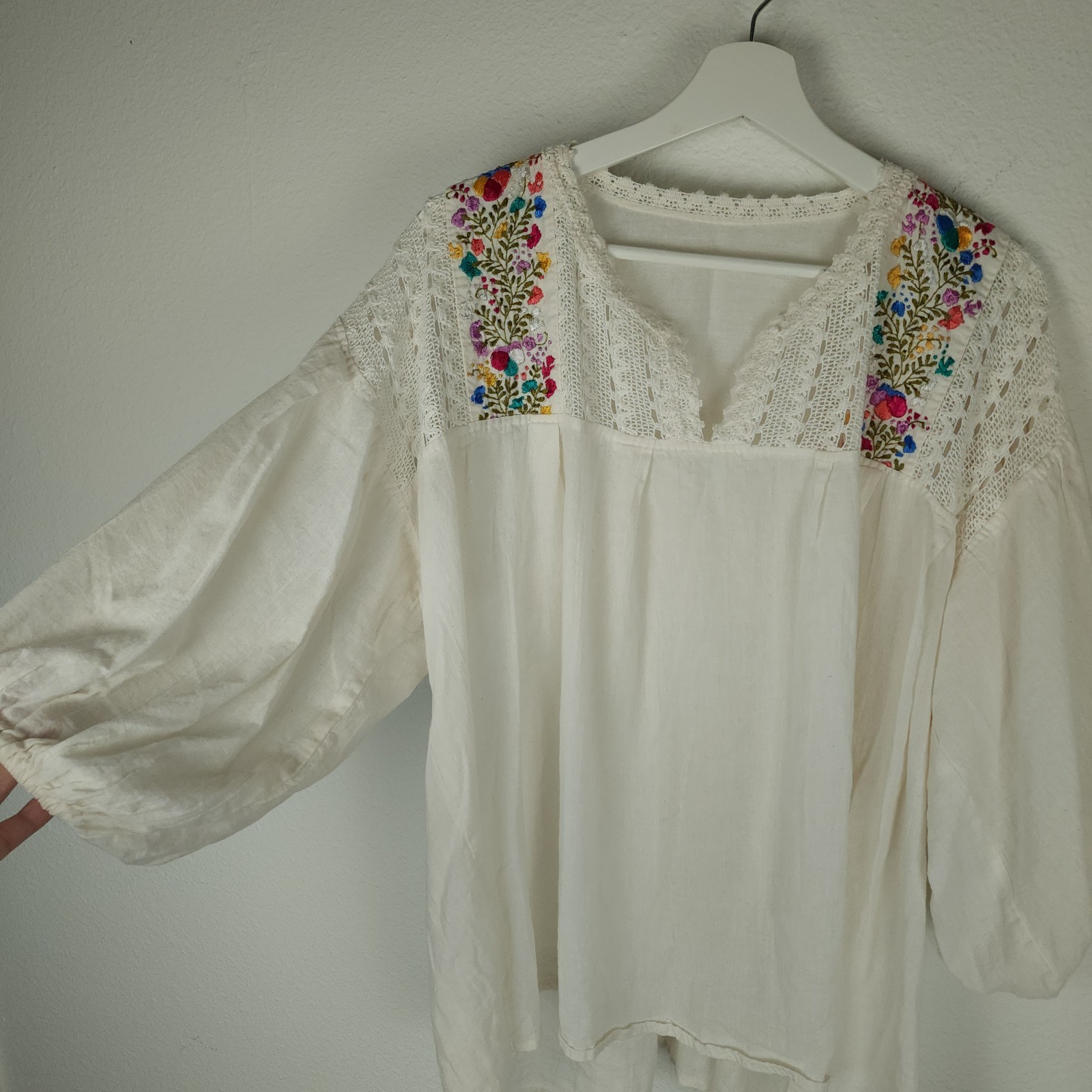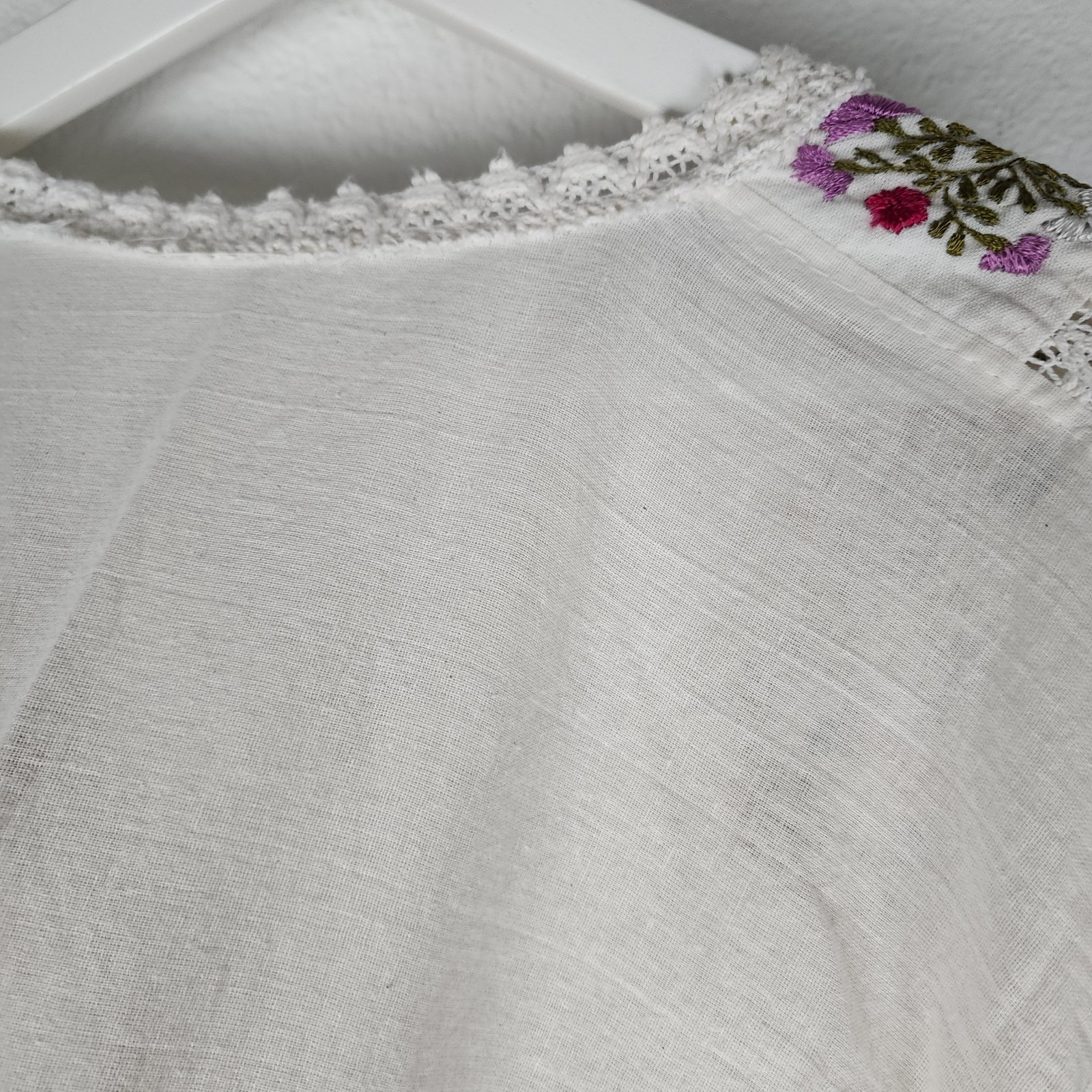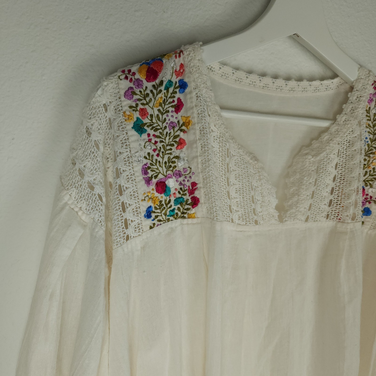 Vintage Oaxacan Mexican White Colorful Embroidery Boho Shirt Peasant Top L/XL