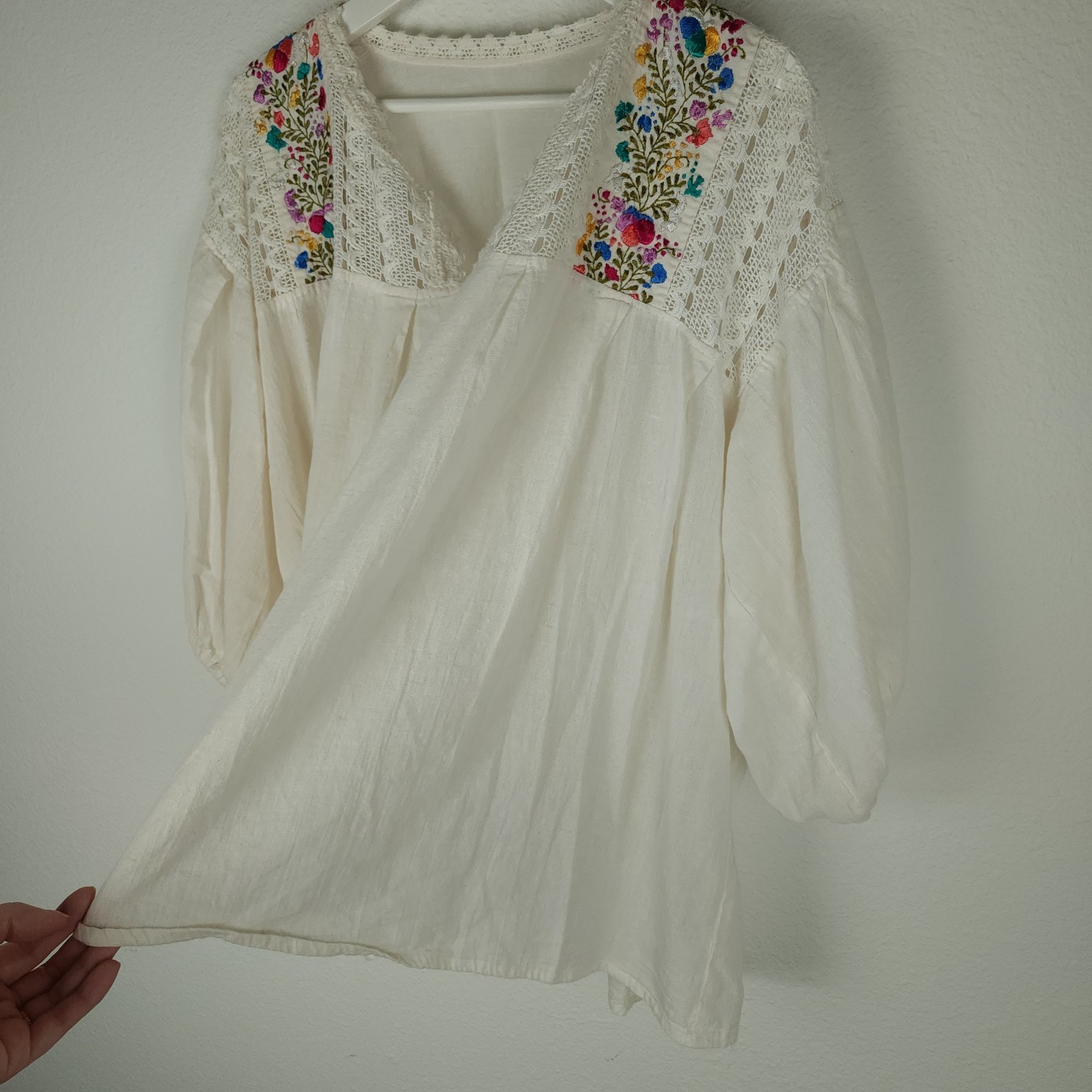 как выглядит Vintage Oaxacan Mexican White Colorful Embroidery Boho Shirt Peasant Top L/XL фото